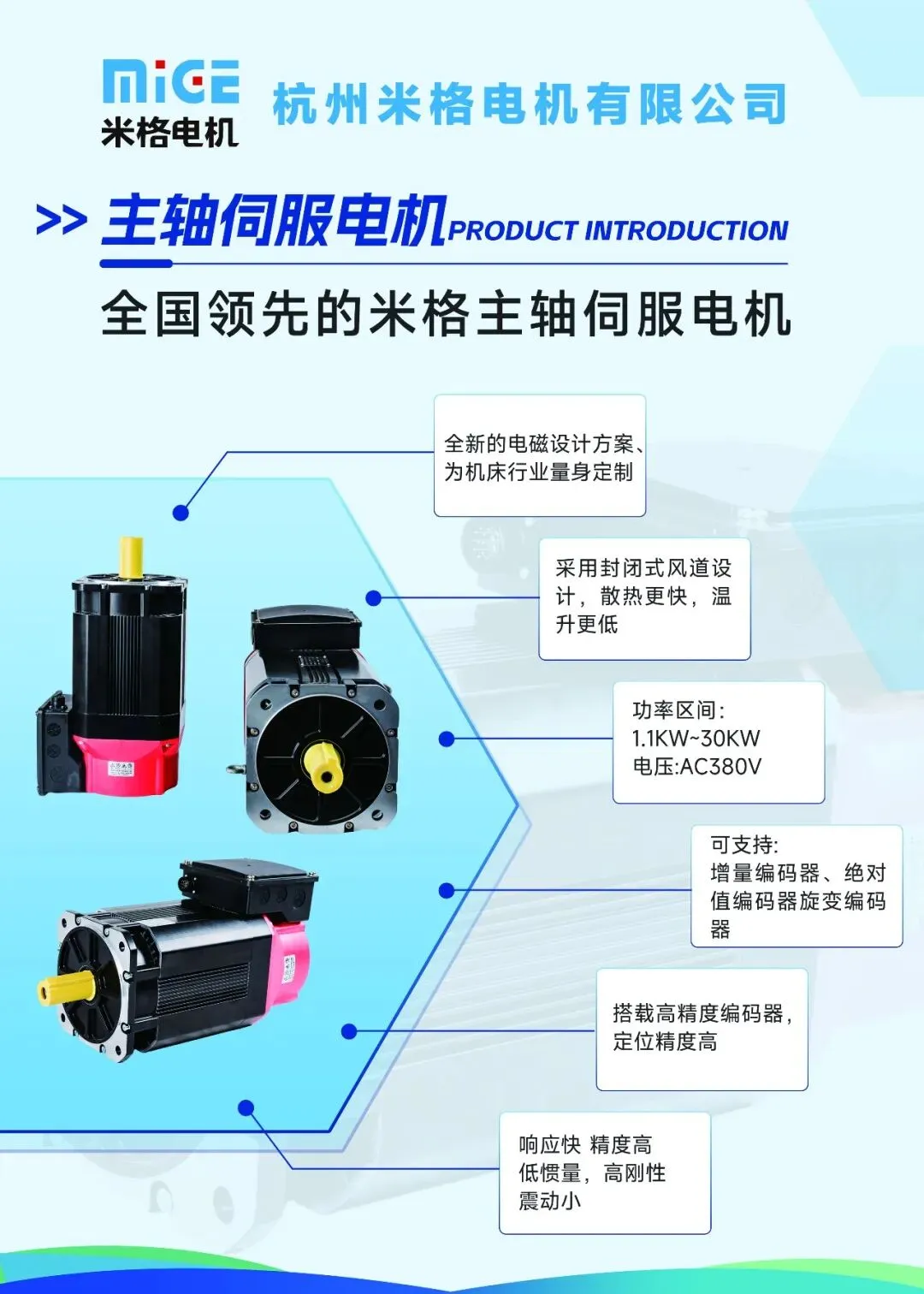 杭州米格电机有限公司是江西特种电机股份有限公司 (江特电机,股票代码: 002176) 下属全资子公司,是一家面向全球市场,集电机研发、生产、销售为一体的公司,核心产品包括交流直流伺服电机、混合式步进电机、风力变桨电机、新能源汽车电机及配套驱动器。自2005年成立以来,公司注重技术创新、产业革新、开发全系列电机产品,广泛应用于数控机床、包装印刷、纺织、机器人、绿色新能源以及风电、新能源汽车等应用领域,可根据客户特殊要求定制产品,公司始终坚持在整个经营过程中以质取胜的方针,为顾客提供高性价比的产品和增值服务为理念,从而实现米格与顾客共同提升经营业绩的目标。米格电机属于技术知识密集型企业,注重知识产权的积累,目前拥有近百项专利,先后被认定国家火炬计划企业、国家节能高效电机生产企业、国家高新技术企业、专精特新、名牌产品、省级技术研发中心和浙江省企业研究院等荣誉。