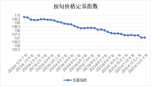 从行业层面来看,2024年12月下旬至2025年12月下旬,全国白酒批发价格总指数-按旬价格定基指数从109.76下降至107.07,整体呈下降趋势,累计跌幅为2.45%。