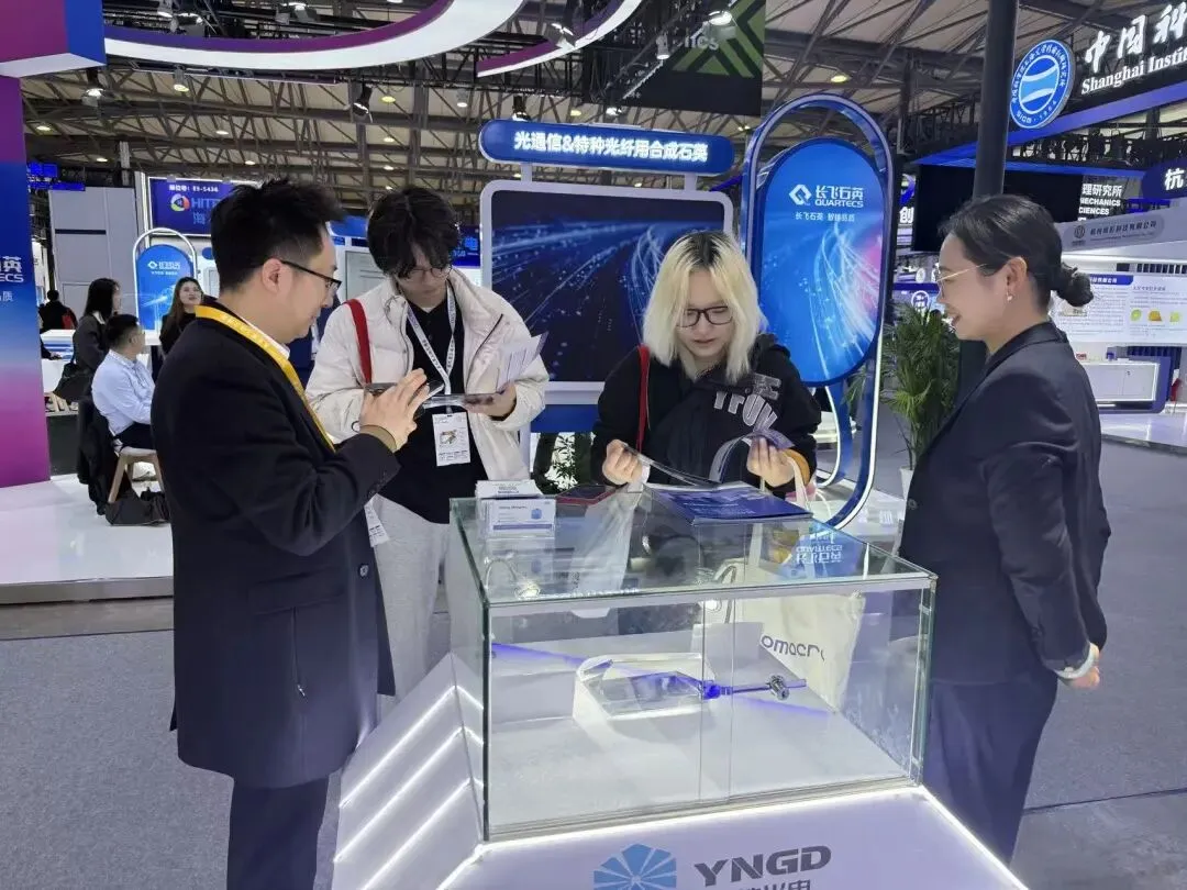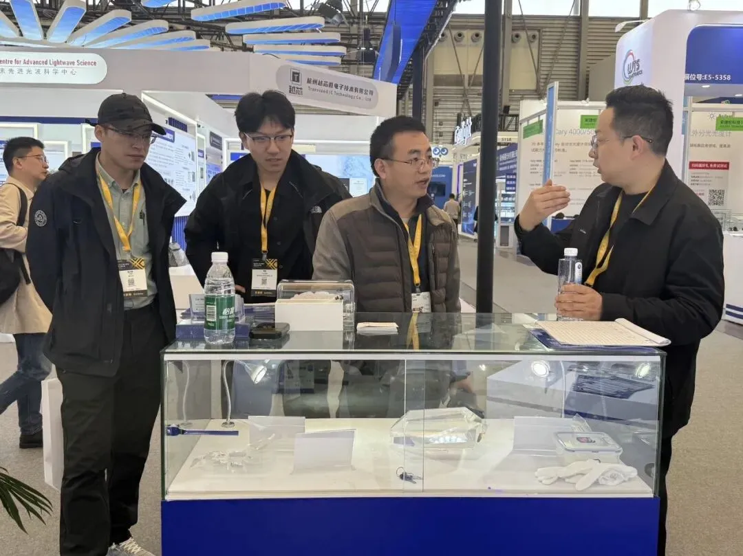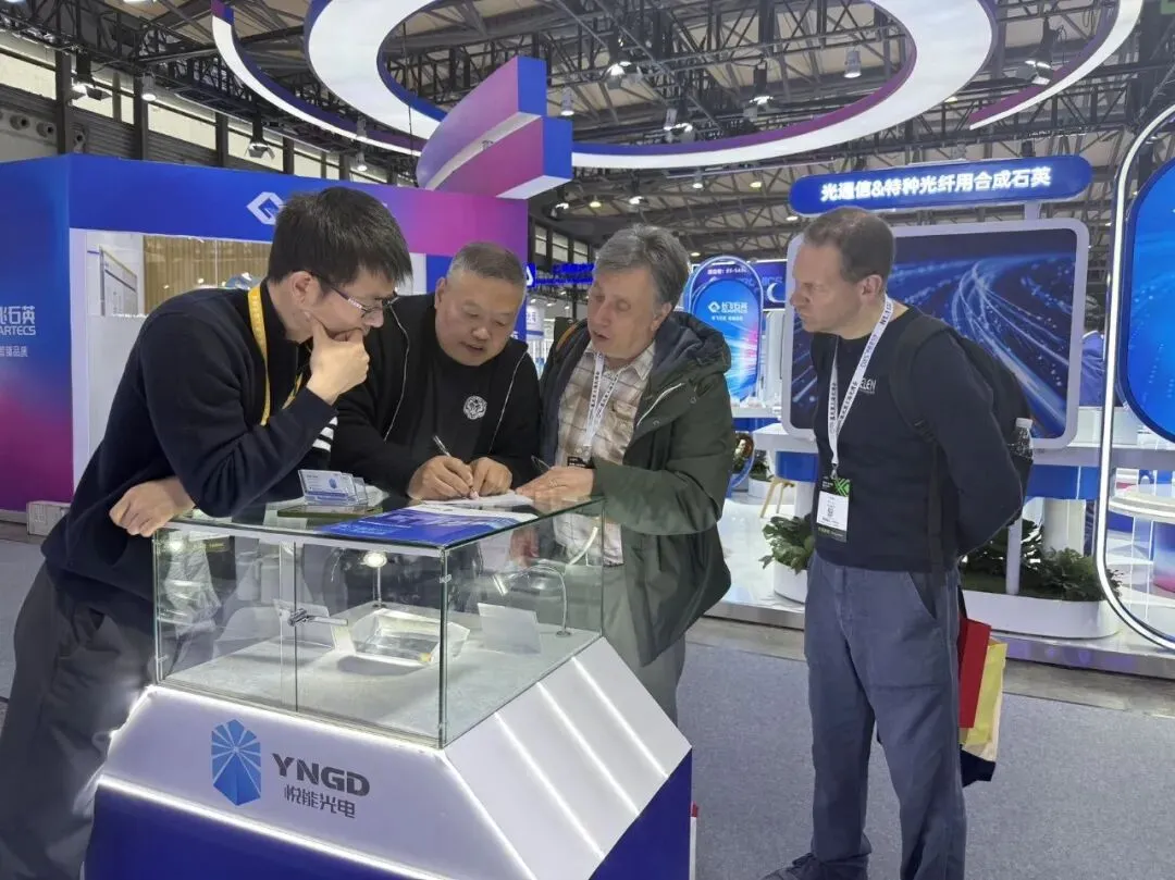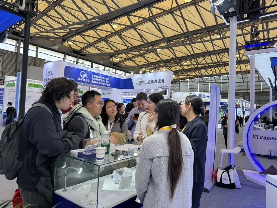 专业观众们对悦能光电展示的晶体光学均匀性、光损伤阈值以及大尺寸突破表现出了浓厚的兴趣。现场技术团队与来访嘉宾围绕LBO晶体在工业激光、医疗美容、量子光源制备等前沿领域的应用进行了深入探讨。