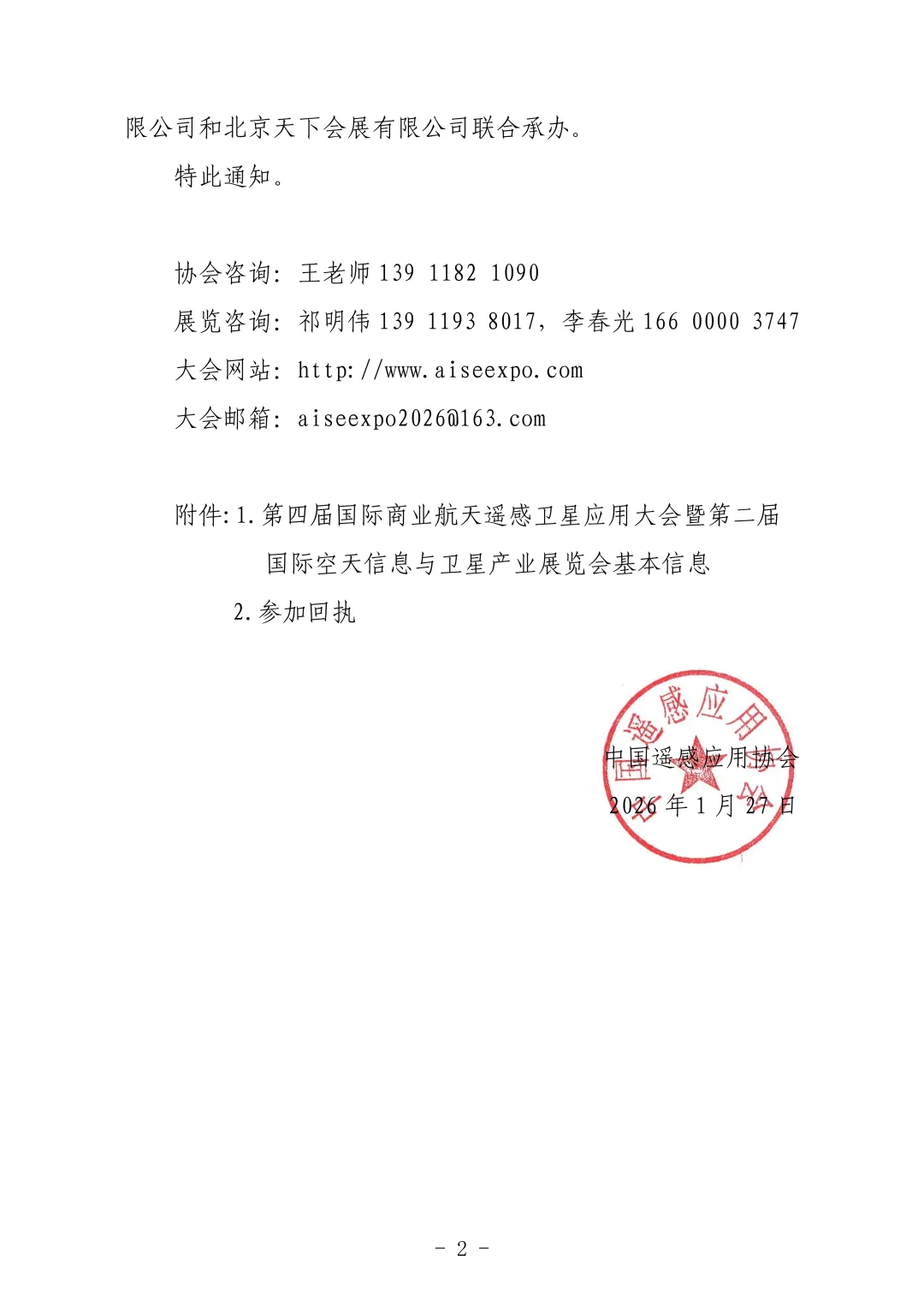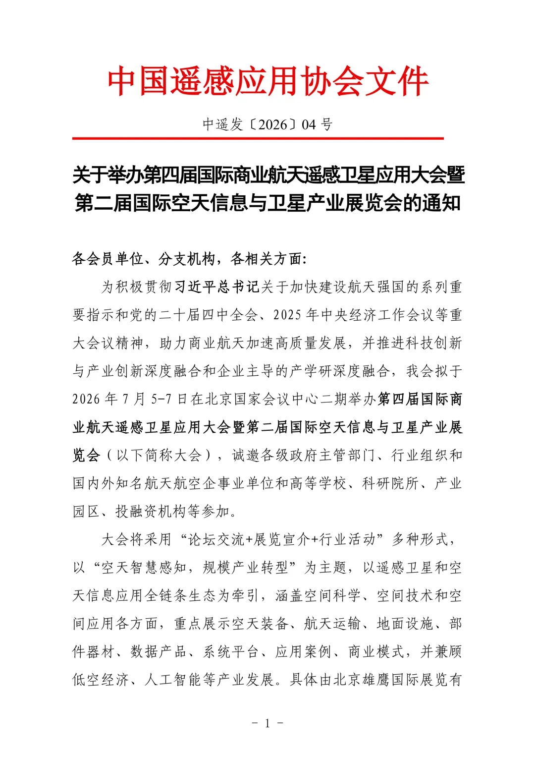 为全面贯彻党的二十大和二十届历次全会精神,落实《中共中央关于制定国民经济和社会发展第十五个五年规划的建议》关于加快高水平科技自立自强、引领发展新质生产力的重大部署,促进航空航天领域的供需结合和供给侧改革、需求侧牵引,并与国民经济和社会发展的主流需求、业务、产业等加强融合,搭建业界深度交流、系统展示、务实合作、协同发展的高端平台,更好服务强国建设和民族复兴伟业,由中国遥感应用协会、北京宇航学会主办,众多权威机构和优势企业联合支持,北京雄鹰国际展览有限公司、北京天下会展有限公司联合承办的第四届国际商业航天遥感卫星应用大会暨第二届国际空天信息与卫星产业展览会,定于2026年7月5日至7日,在北京国家会议中心二期隆重举办。