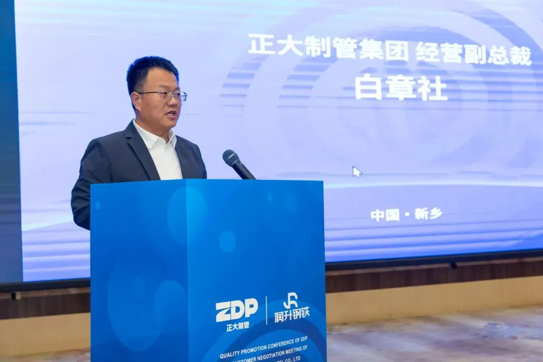 会议伊始,正大制管集团副总裁白章社出席并致辞。白总在发言中强调,正大制管始终坚持以品质立企、以技术强企,持续推动产品升级与智能制造深度融合,致力于为客户提供更可靠、更高效的钢管产品。