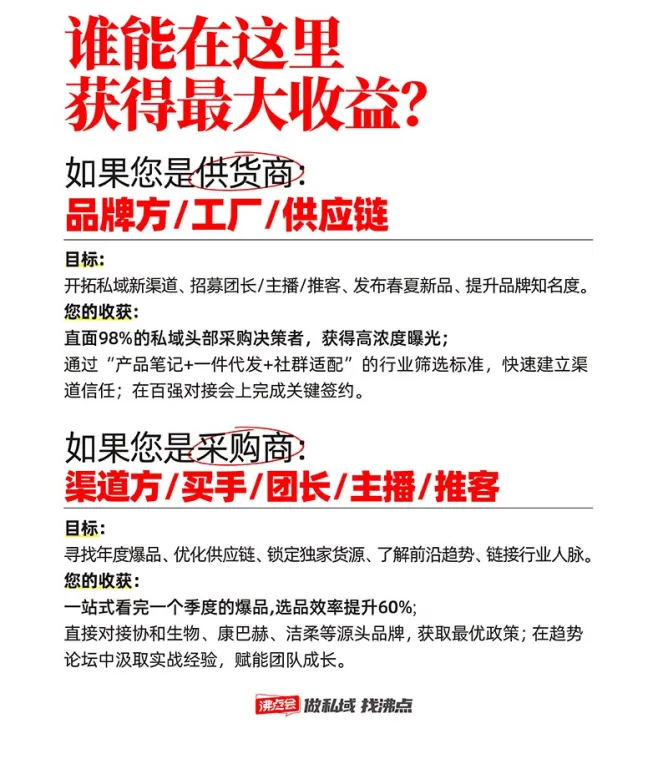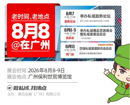 北京+广州,南北联动,一次参展,对接全国私域团长。无论是北方市场的稳扎稳打,还是南方市场的爆发增长,沸点会都能帮您补齐渠道短板,实现真正意义上的全域覆盖。