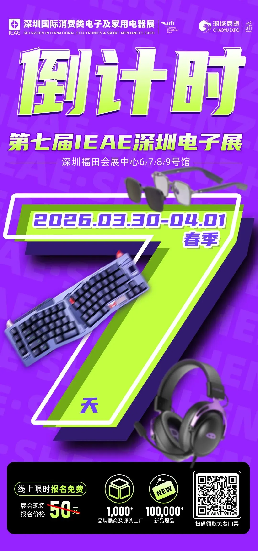 由广东电子商会支持、广东潮域展览有限公司、广东潮域科技有限公司主办、深圳潮域展览有限公司承办的“第七届IEAE深圳国际消费类电子及家用电器展”,将于2026年3月30-4月1日在深圳福田会展中心盛大启幕,全面展现电子电器行业的科技生态与发展新趋势。