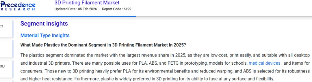 耗材作为3D打印机的“刚需补给”,成为隐藏的高增长赛道——无论打印机性能多强,都离不开耗材的支撑。例如,塑料材料在去年已逐渐占据市场主导地位,其中的PLA材质具有环保优势且不易翘曲,深受3D打印新手所倾向。
