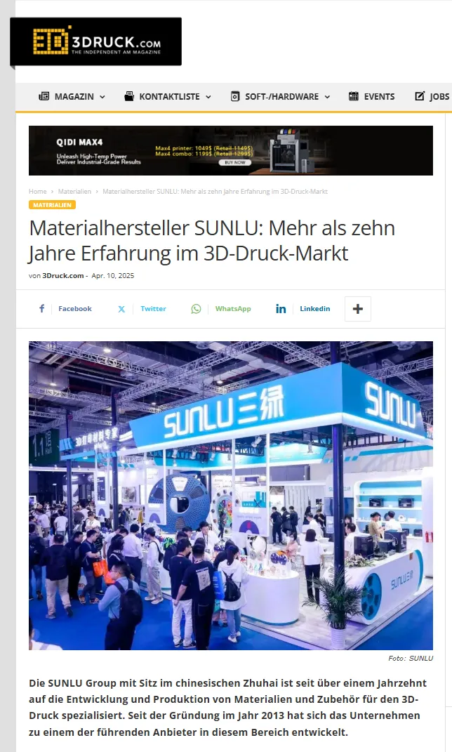 此外,德国专业媒体3Druck曾对SUNLU进行深度企业报道,系统梳理其成立时间、产线规模、全球销量及知识产权等核心信息,构建了品牌在专业圈层的长期公信力。