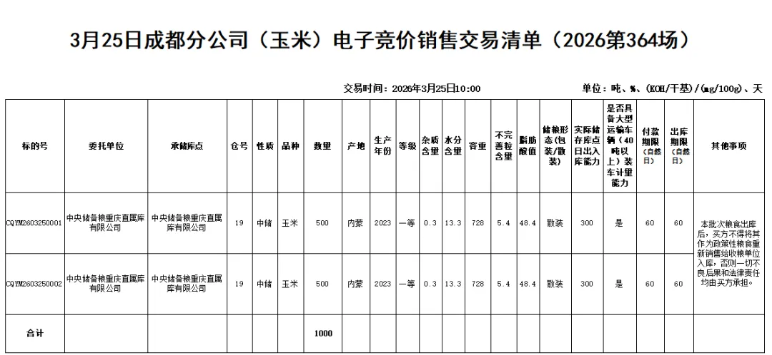 受中国储备粮管理集团有限公司成都分公司委托,重庆市粮油批发市场有限责任公司(即国家粮食重庆交易中心,以下简称“批发市场公司”)定于2026年3月25日10:00举办成都分公司(玉米)电子竞价销售交易会,现将有关事项公告如下:
