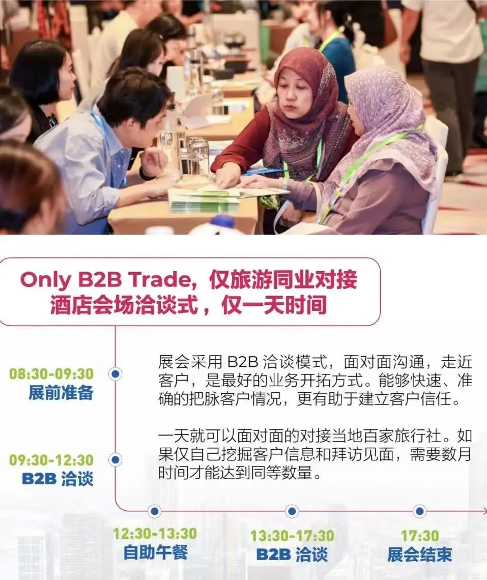 采用“一对一桌面对接”模式,精准邀约当地实力组团社、MICE会奖机构、研学组织及线上平台等具真实采购需求的买家;2025年吉隆坡首展吸引76家展商与415位优质买家,现场洽谈成效显著。