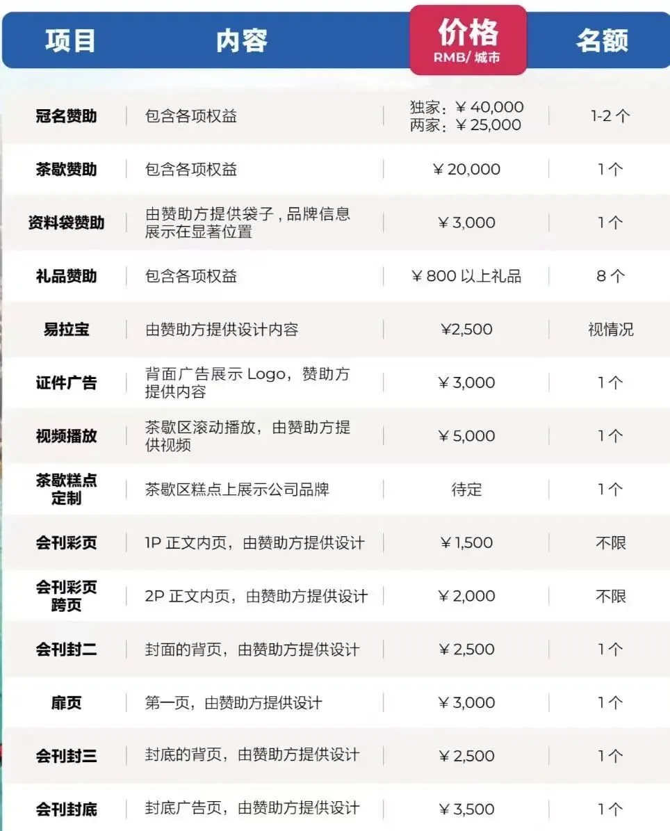 开放全场冠名、茶歇赞助、会刊广告、展位升级等合作资源,支持企业定制专属品牌合作方案。