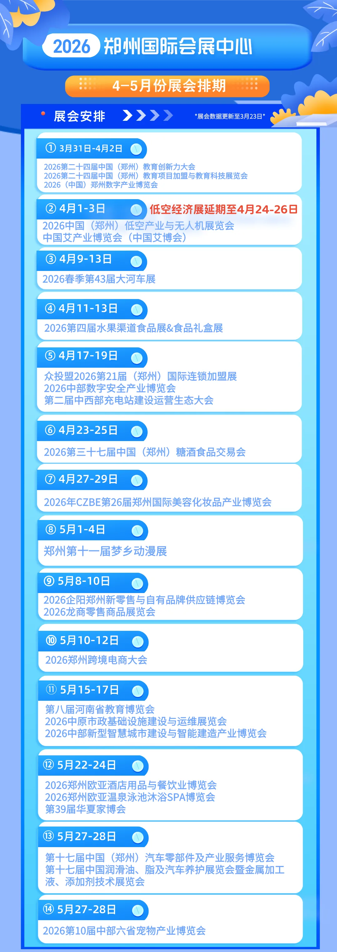 ● 2026年4月-5月份河南郑州展会预报表更新时间为2026年03月24日;