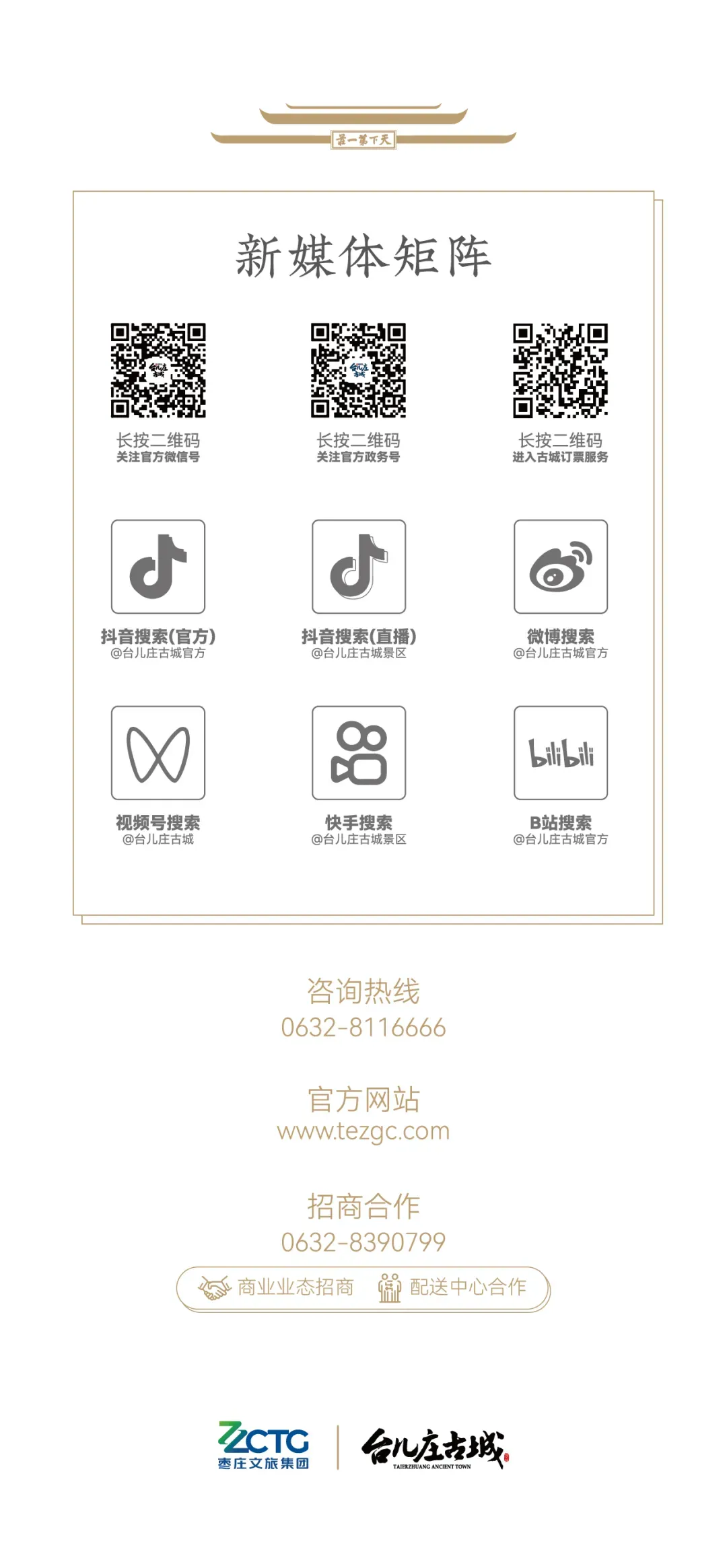 招商热线:0632-8390799招商地址:台儿庄古城景区内招商中心