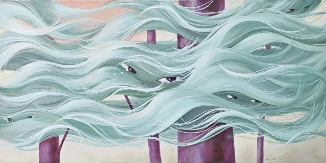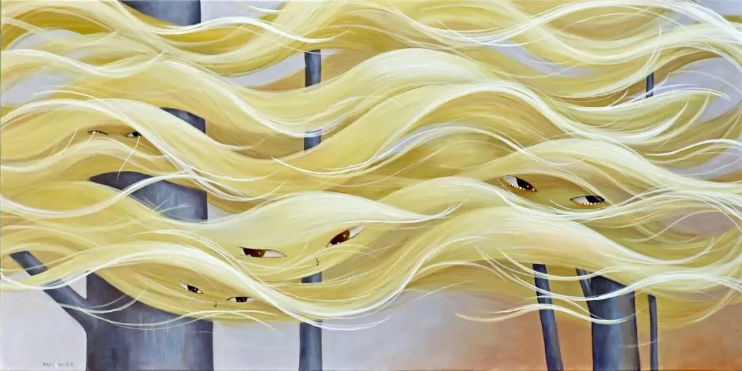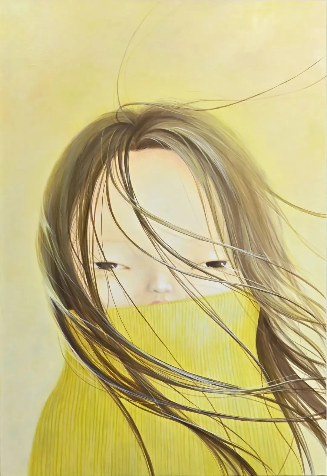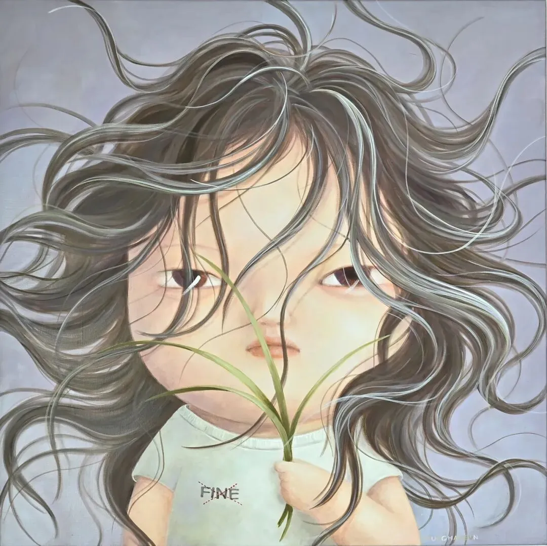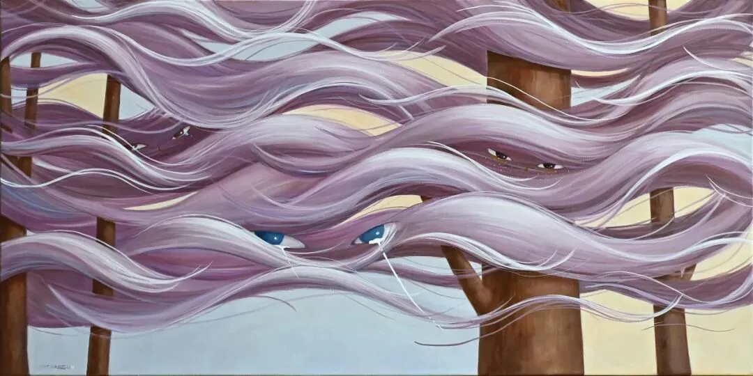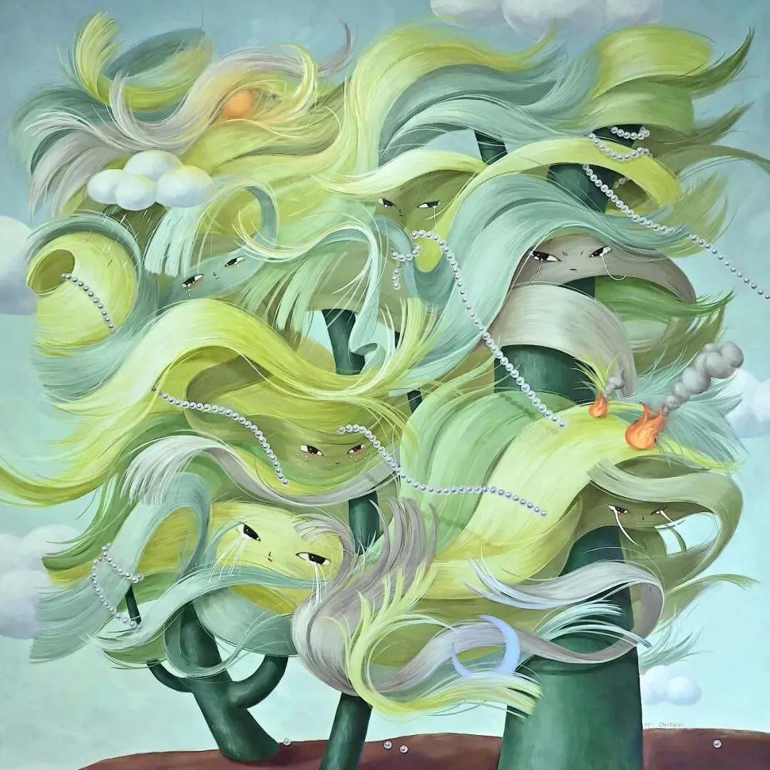 在文彩银的创作中,"起风"并非自然现象的再现,而是一个关于情绪如何显形的隐喻。在效率优先的社会节奏与东亚文化根深蒂固的情感克制下,"我没事"早已成为本能的自我保护,而悲伤、焦虑、脆弱等情绪往往在浮出水面之前就被迅速压回。文彩银精准切入这一集体心理症候,用画笔让被藏匿的情绪"乘风而起"——化为缠绕飘逸的发丝、凝结的珍珠,或拟人化的风灵形象,发展出一种温柔而具有抵抗性的真诚。