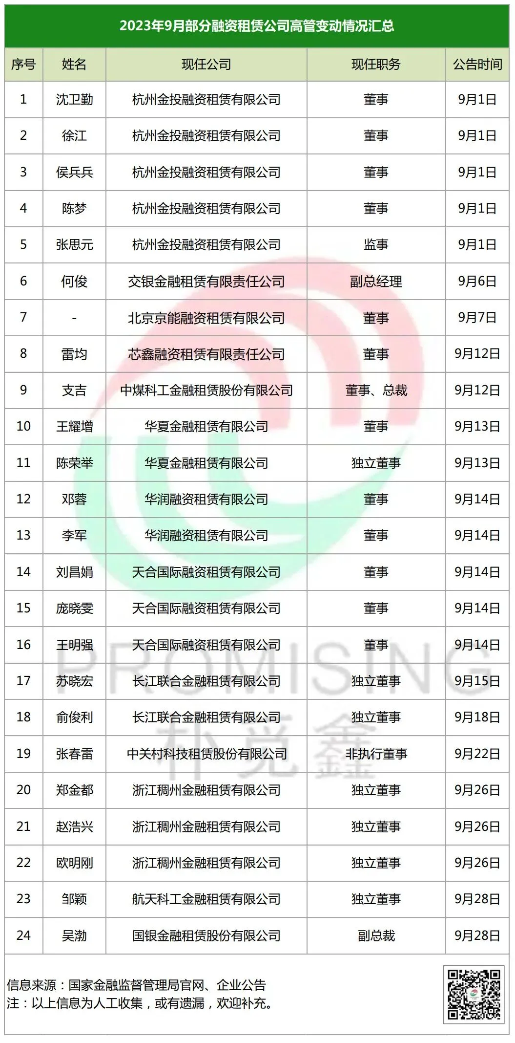 9月14日,华润租赁发布公告,公司原董事翁菁雯女士和赵伟先生任职到期,根据公司股东会决议,任命邓蓉女士、李军先生为公司董事。