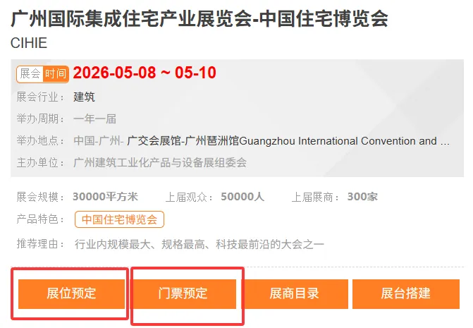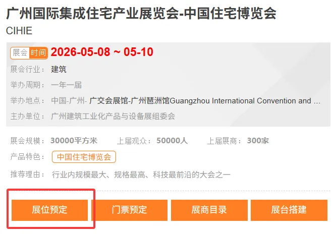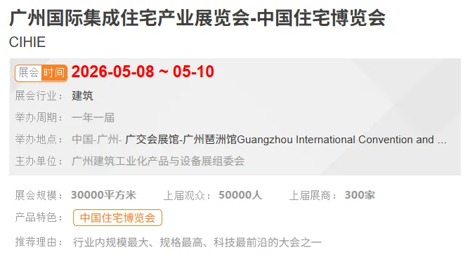 广州国际集成住宅产业展览会-中国住宅博览会(CIHIE)作为一年一度的装配式建筑业嘉年华,通过多元化、多角度交流互动,共同分享装配式建筑相关的最新成果和未来发展的前沿方向。让企业产品在短时间内“打响、打亮、打远”,帮助企业实现自身品牌推广和产品展示,蹭足展会热度,不断刷新曝光率,住博会一直在努力,以进击步伐潜望装配业态。