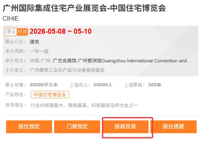 广州国际集成住宅产业展览会-中国住宅博览会(CIHIE)凭借自身品牌号召力,吸纳了众多建筑业翘楚争奇斗艳,充分融合多家供应链上优秀企业资源,覆盖装配式建筑相关开发建设、设计、施工、构件生产、产品配套等产业链上下游各领域。如:艾尔柯瑞特、中建科工、广州工程总承包集团、中国建筑技术集团/中国建筑科学研究院、凡林装配式/吉林建筑大学设计研究院、晶宫绿建、广州房建、景龙建设、广州建筑装饰集团、宝力控股集团、广东寰宇、越达建筑、山东方圆、现代营造、菲力绿色、松本绿色、旭华圣洛迪、斯派尔、丰源钢构、中构新材、玮莱房屋、魔仓住宅、中配集成房屋、中正建筑、爱上柜族、中创智造、玉发达、汇达集成房屋、酷家乐、新润成陶瓷、雅穗集成家居、赫来斯、艾珀耐特等国内外装配式建筑领域前沿企业悉数亮相。