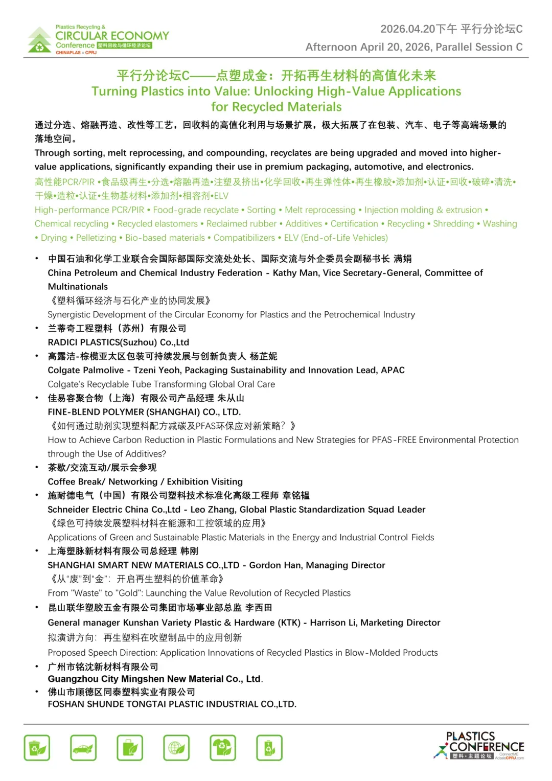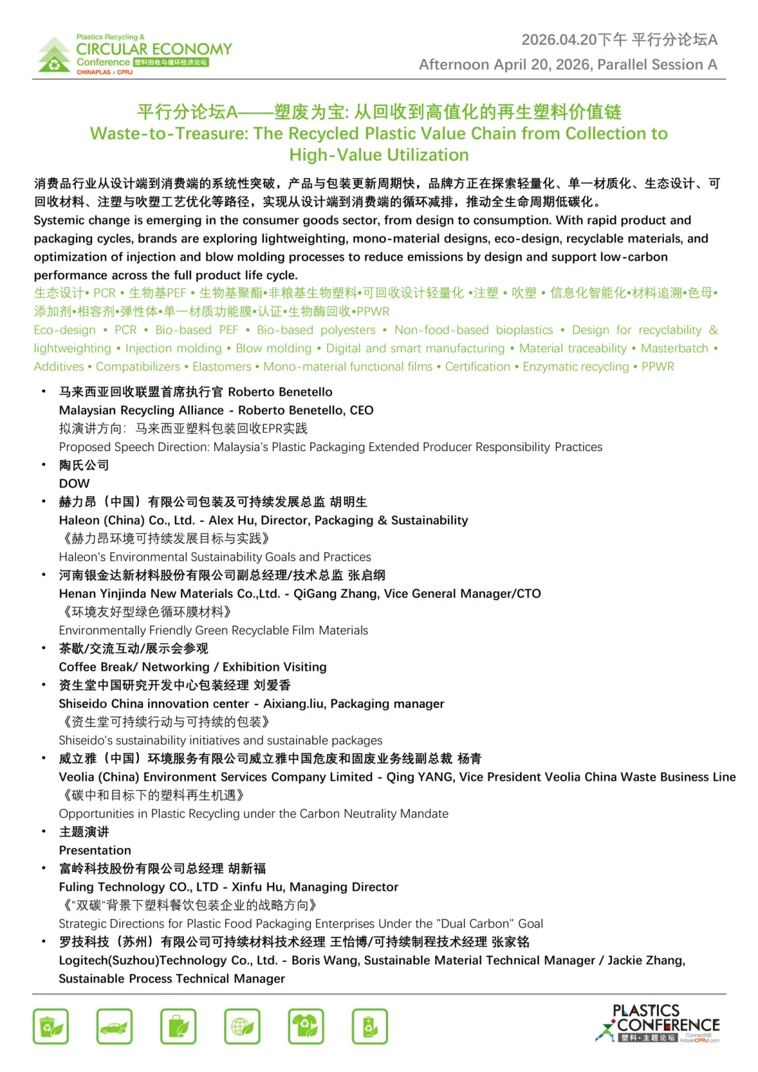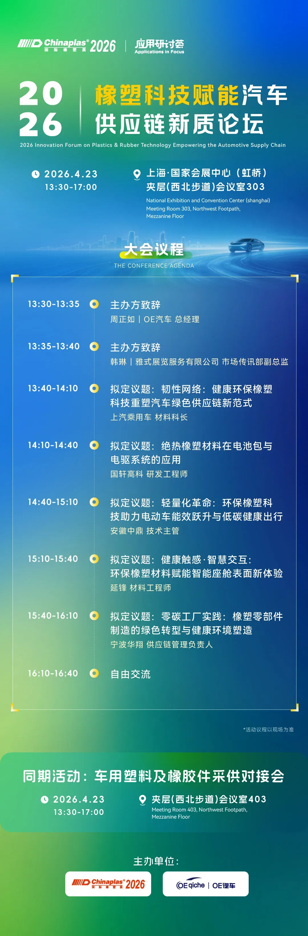 活动涵盖五大主题:创新包装方案、绿色减碳方案、车用塑料方案、2026橡塑新材料及专精特新科技精选(新增)。