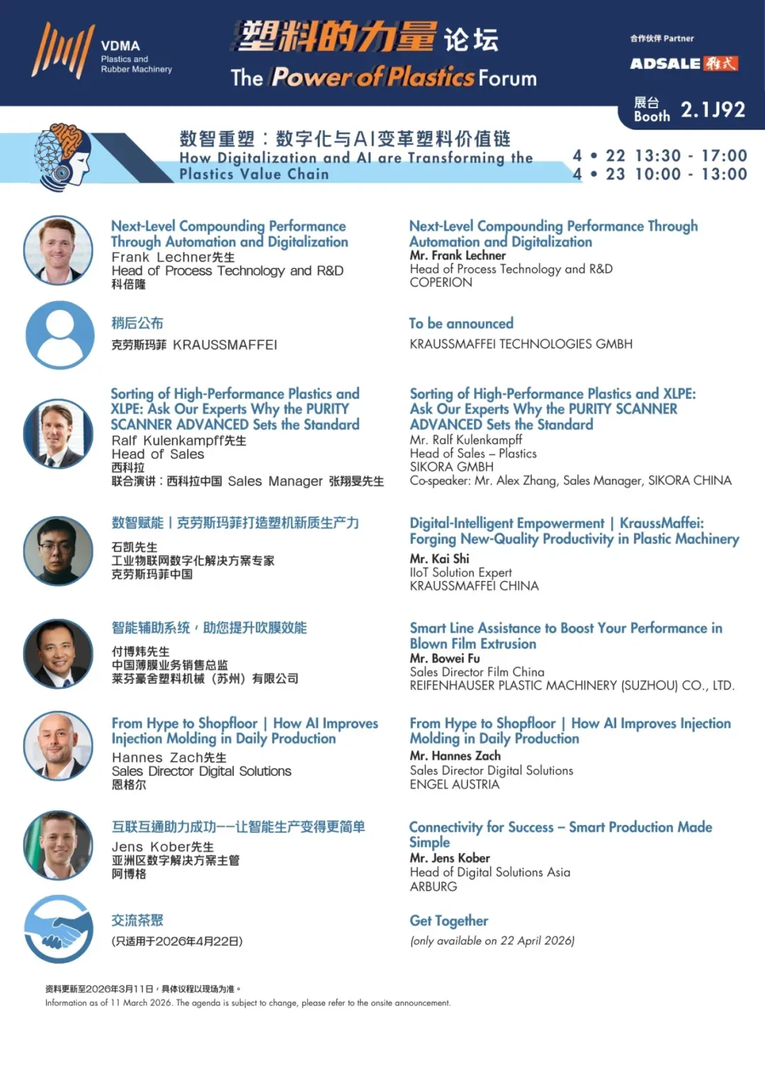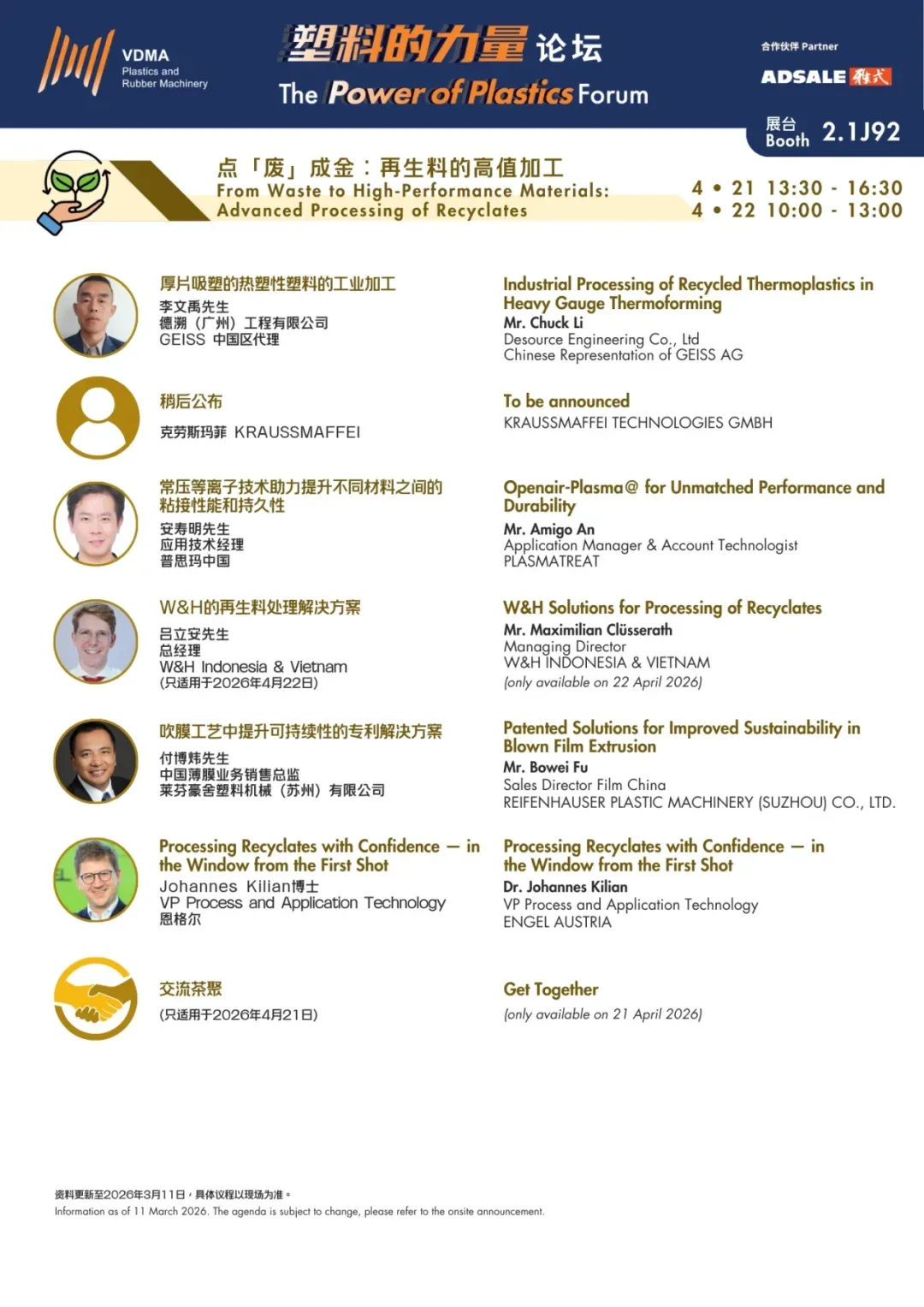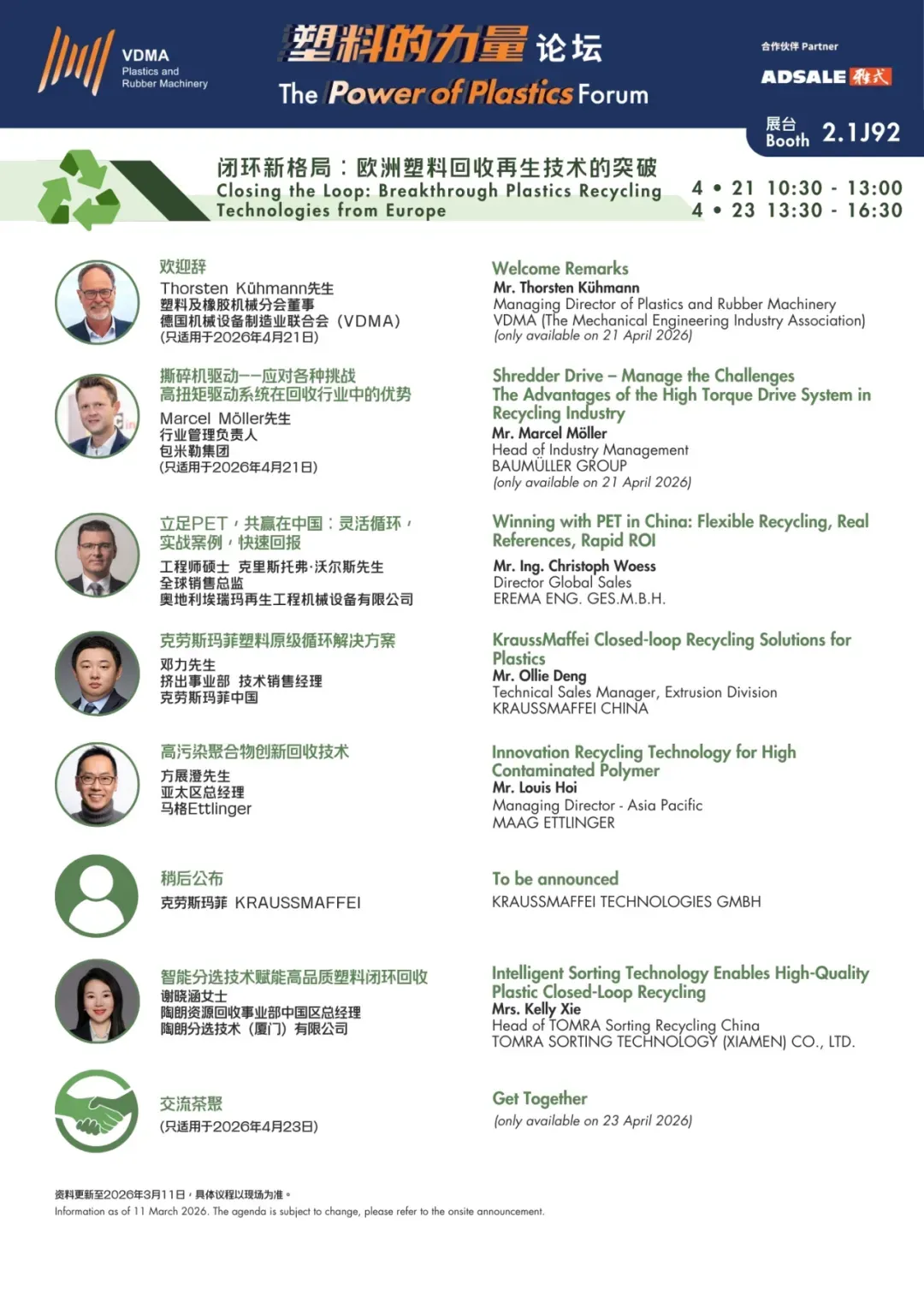 现场聆听VDMA专家与行业领袖分享尖端回收技术、再生料智能处理,以及数字孪生、产品护照等AI数字化解决方案。