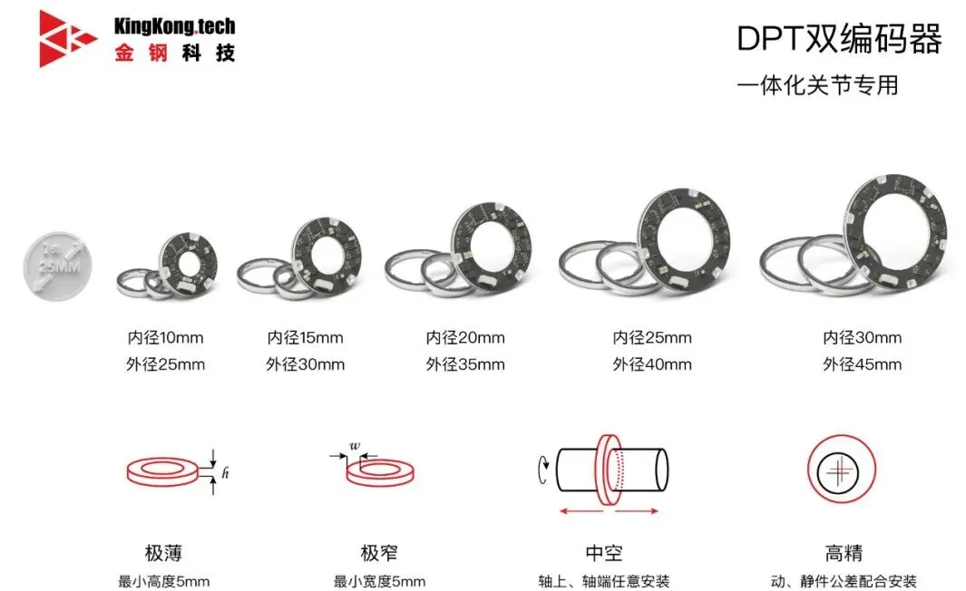 伴随着机器人行业从“简单能动”到“动的更好”,再到“与人交互”的阶段性跨越,其对于编码器在“更小、更精、大中空、低能耗、抗干扰”方面的需求愈发提升,这与「金钢科技」机器人磁编码器的产品特性高度匹配。