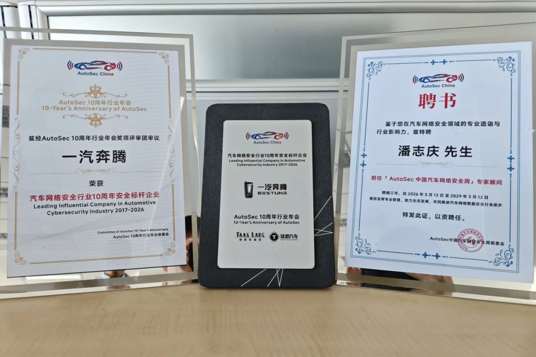 近日,在“AutoSec 2026中国汽车网络安全及数据安全合规峰会”十周年盛典上,一汽奔腾荣获“汽车网络安全行业10周年安全标杆企业”称号,智能网联开发院信息安全高级主任潘志庆获评“汽车网络安全行业10周年最具影响力人物”。