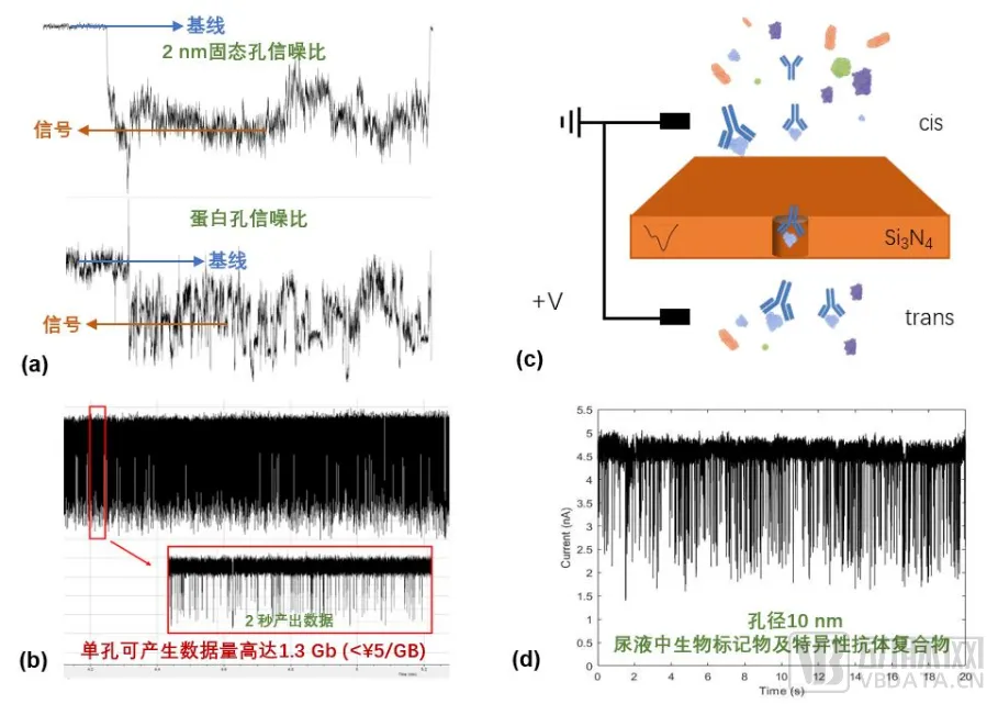 固态纳米孔检测单链DNA(a.b)以及抗原抗体复合物(c.d)