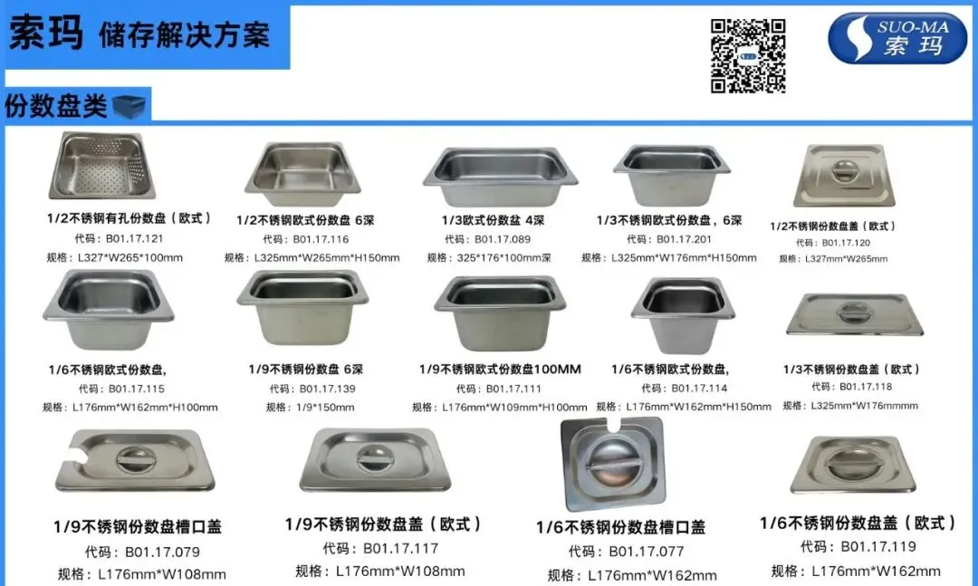 不锈钢款,欧式设计,深 / 浅规格齐全,带孔款、槽口盖等配件丰富,适配自助餐、后厨备餐,耐腐蚀易清洁