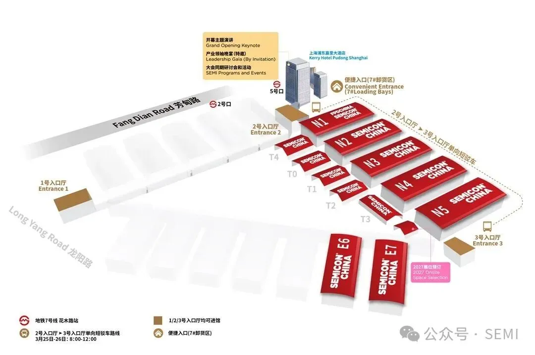 SEMICON China 2026 观展须知:•请完成观众登记并携带身份证/护照/港澳台通行证入场。•SEMICON/FPD China 2026的登记大厅为展馆1号入口厅、2号入口厅和3号入口厅,三个入口厅及7# 卸货区便捷入口均可进馆。•展会同期会议于3月22日-27日在上海浦东嘉里大酒店及上海新国际博览中心举办(浦东嘉里大酒店近地铁7号线1号口)。•观展路线图