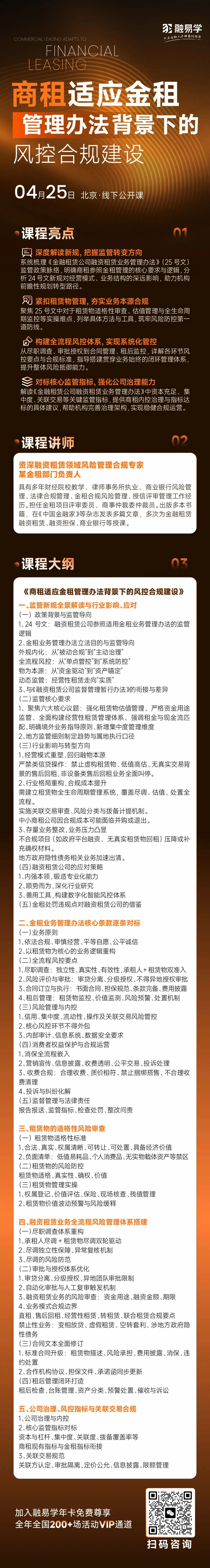 最近4月25日在北京有一个线下课程活动,正是围绕当前融资租赁适应金融租赁管理办法衍生的一系列核心问题展开研讨的,从监管变化、项目逻辑,到具体的资产判断和交易结构设计,都会做系统性的梳理和拆解。