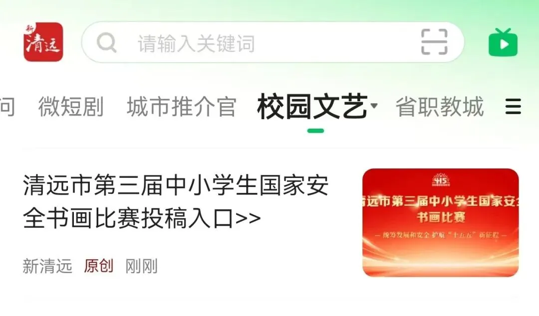 步骤二:打开新清远客户端,点击“校园文艺”频道,选择“清远市第二届中小学生国家安全书画比赛”征稿入口,进入投稿页面