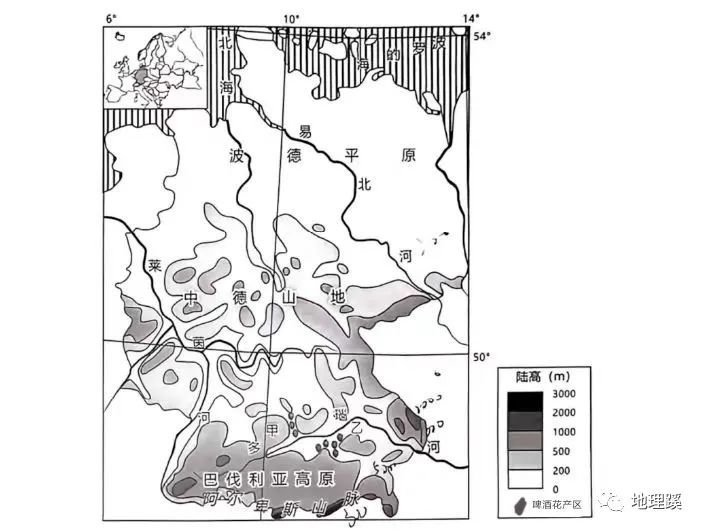 德国啤酒花种植区的分布特点,一目了然,即南多北少。但这并不是答案的全部,如果仅是如此回答的话,失分较多(或没有分数)。结合提问,我们可知出卷人的意图是让我们从“地理位置(含经纬度位置和相对位置——如海陆位置)和地形”角度出发,来回答其分布特点。那么,具体来说,德国啤酒花产区主要分布于“较低纬度”的(东)南部,且距海较远。此外,多在高原山地河谷分布(高原山地海拔高,光照充足;河谷灌溉便利且热量充足)。