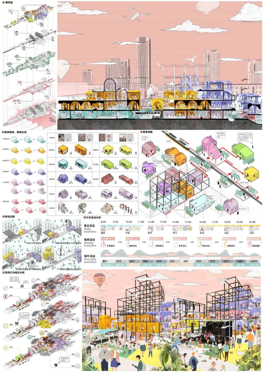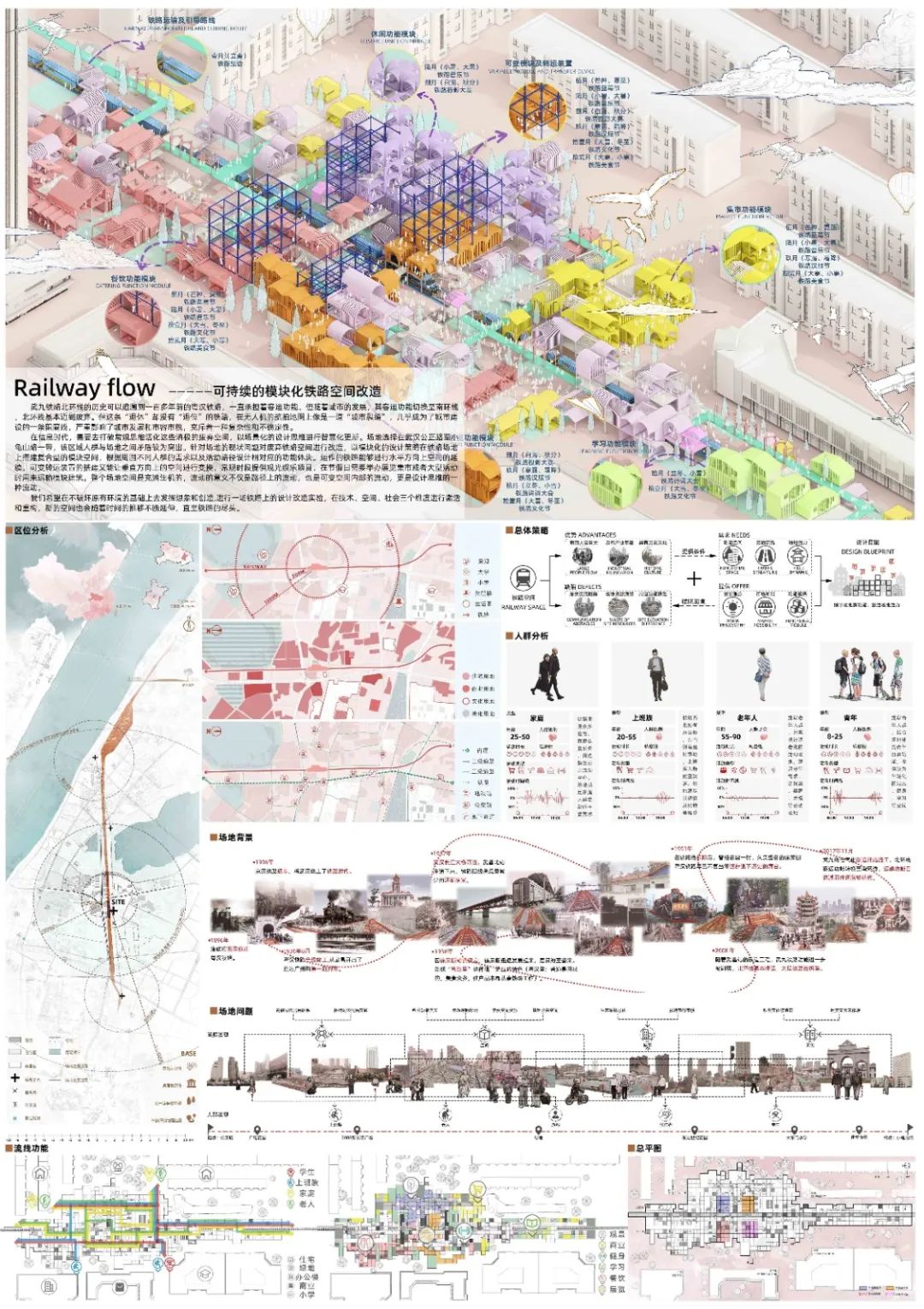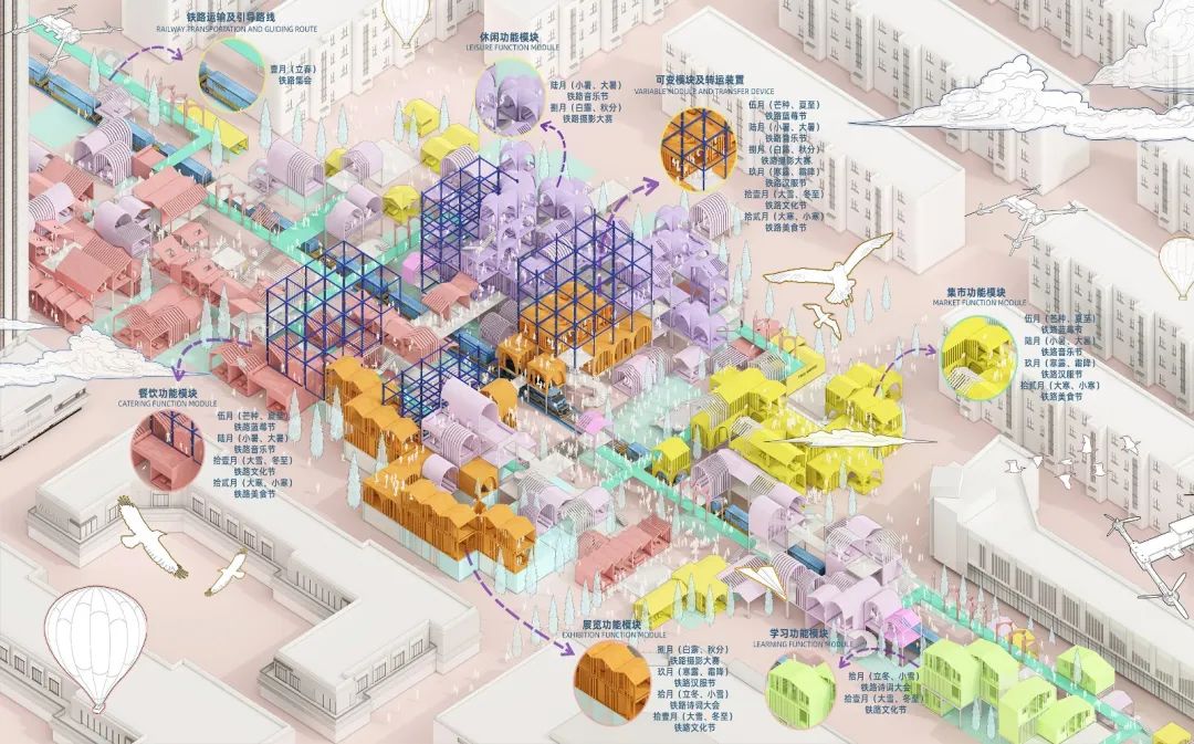 设计说明:武九铁路北环线随着城市的发展基本遭到废弃,这条“退休”却没有“退位”的铁路像是一道“城市裂缝”,几乎成为城市建设的一条阻隔线,严重影响了城市发展和市容市貌。因此设计团队希望在不破坏原有环境的基础上去发挥想象和创造,针对场地现状问题进行一场铁路上的设计改造实验。在技术、空间、社会三个维度进行激活和重构,以模块化设计策略在铁路场地上搭建复合型模块空间,根据周围不同人群需求以及活动路径设计相对应的功能体块。运作的铁路能够进行水平方向上空间的延续,可变转运装置的搭建又能让垂直方向上的空间进行变换,常规时段提供观光娱乐项目,在节假日需要举办展览集市或者大型活动时用来运输模块建筑。整个场地空间是充满生机的,流动的意义不仅是路径上的流动,也是可变空间内部的流动,更是设计思维的一种流动。