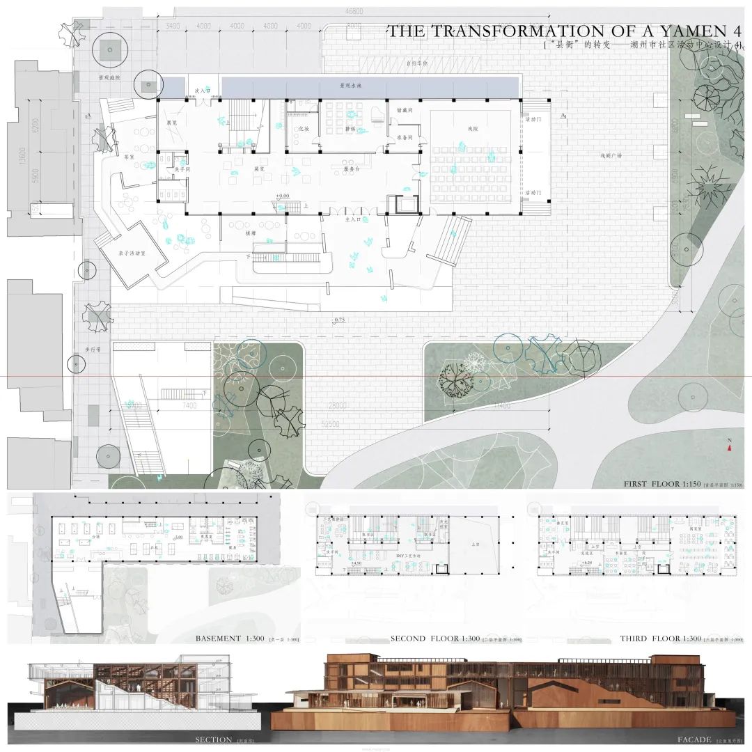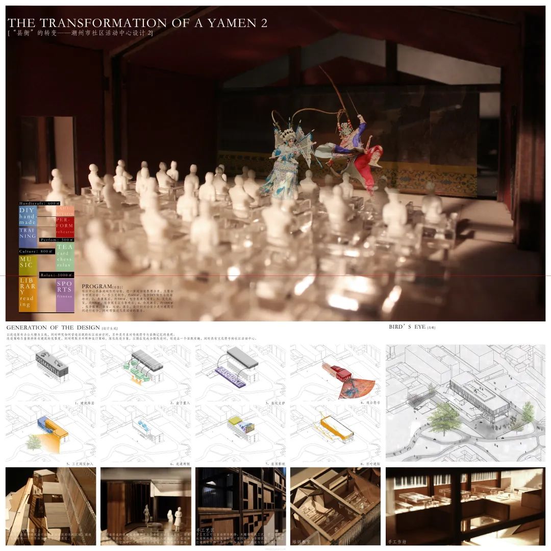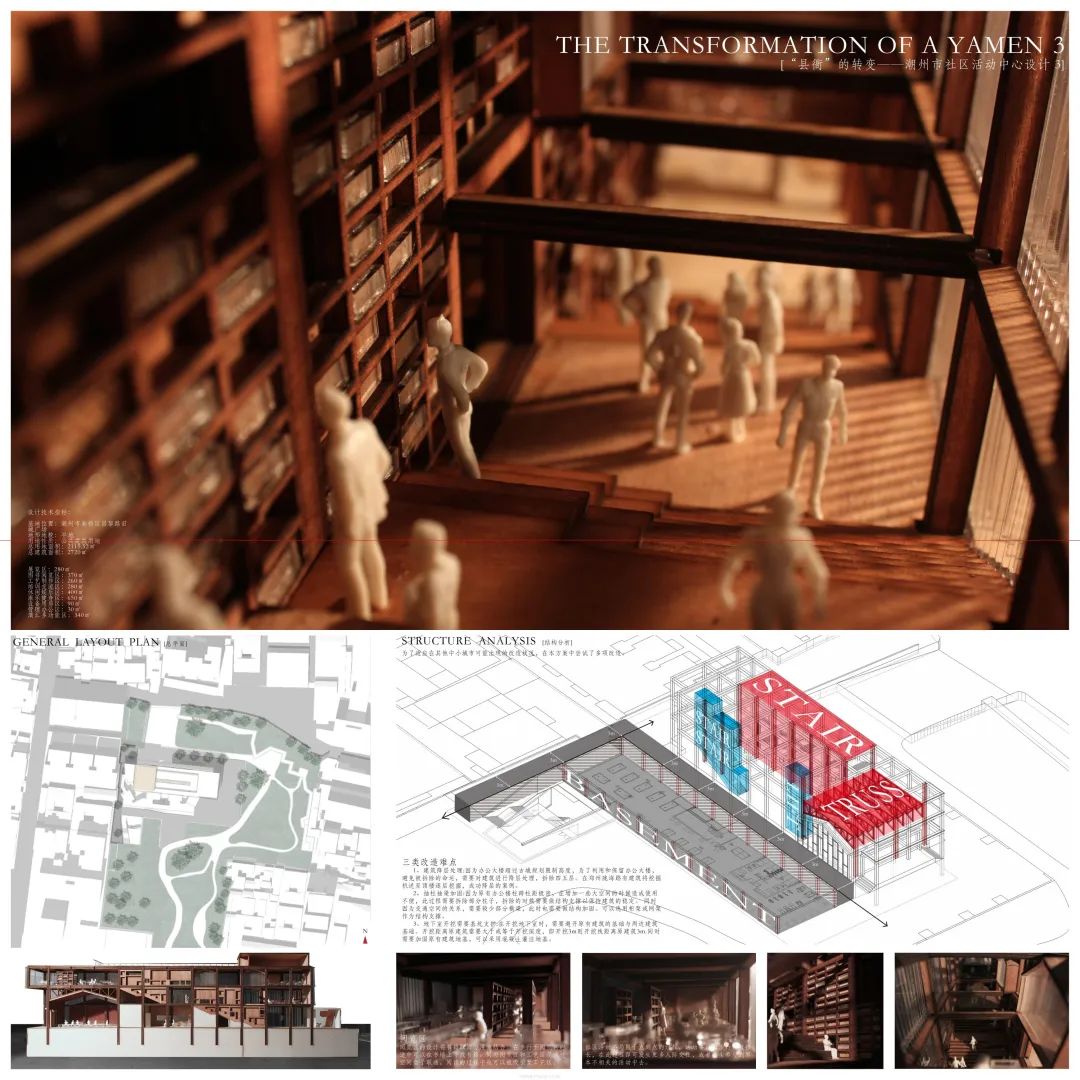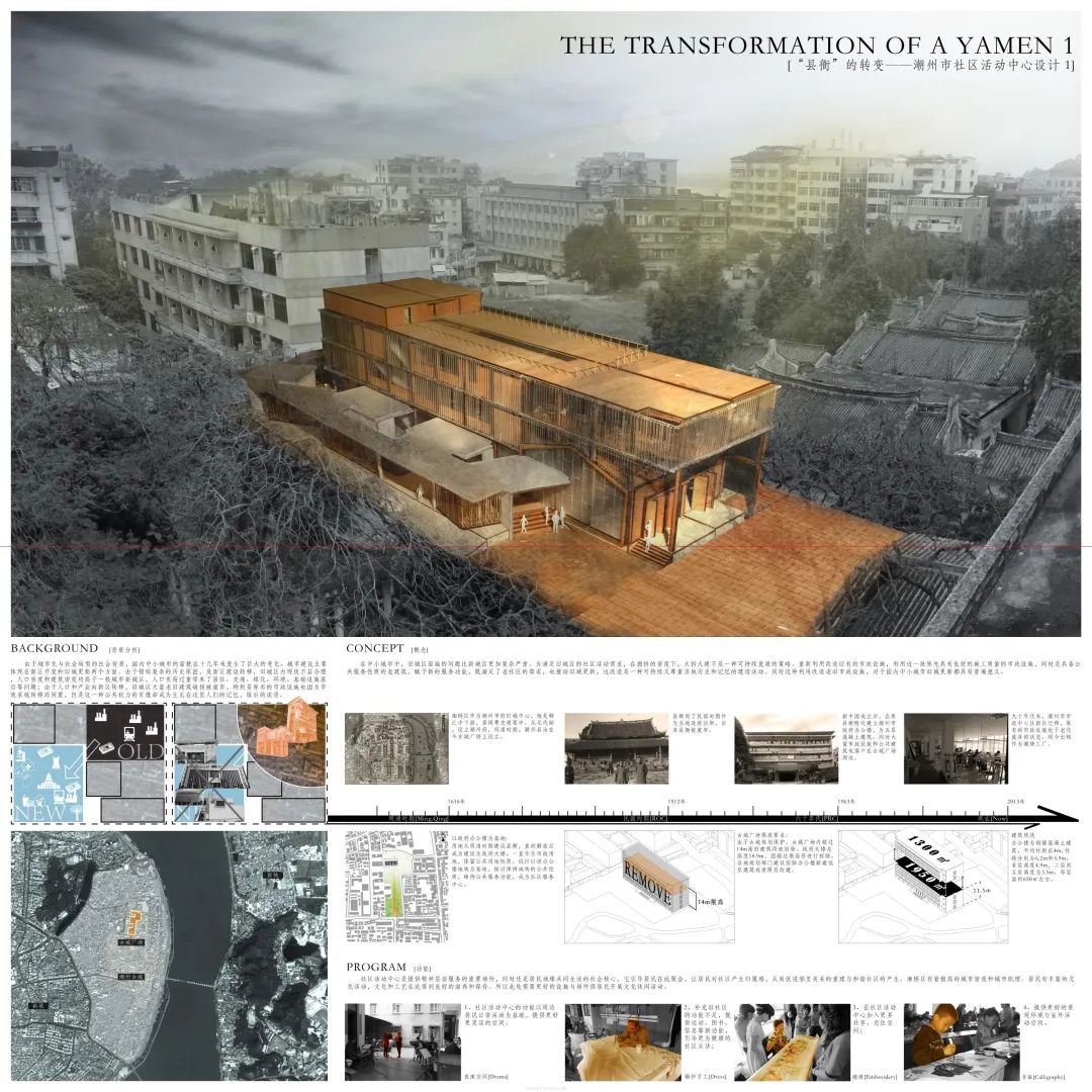 设计说明:城市化与社会转型的背景下,国内中小城市面貌在十几年来发生了巨大的变化,旧城区大量老旧建筑破损被废弃,特别是原有的市政设施也因为市政系统转移而闲置。设计师团队以改造原有办公大楼为主线,同时研究如何营造活跃的社区活动空间,寻求对传统符号与县衡的记忆。改造策略选择尽量保持原有建筑的完整度,同时吸取另外两种设计策略,深化改造方案,以期在完成合理改造时,创造出一个活跃有趣、同时具有文化符号的社区活动中心。