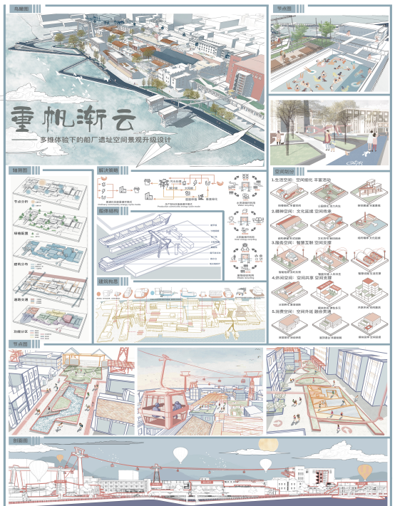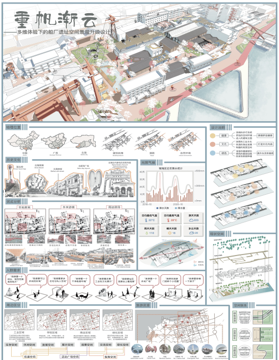 设计说明:重帆渐云——多维体验下的船厂遗址空间景观升级设计项目希望打造一个集健康、文化、绿色为一体的空间,目前环境面临船只停放混乱、房屋拥挤、景观缺失、绿化单一等问题。设计师将空间需求分为街道、活动广场和院落三部分,通过连续的步行系统、舒适的空间环境与迷人的建筑立面实现空间的便捷健康,浓厚的工业文化、快速的渔业发展、有趣的观赏空间则彰显其文化内涵,适宜的植被绿化、绿色的基础设施与自发性家庭种植有助于提升生活幸福感,最终通过对现有空间的改造,完成绿色渗透、边界软化、功能互动等空间联系。