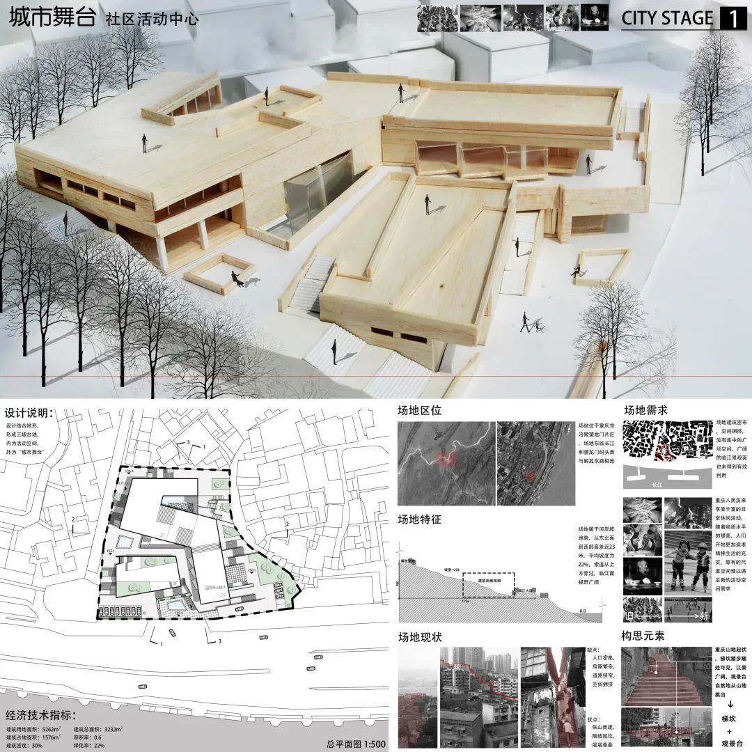 设计说明:场地位于重庆市涪陵望龙门片区,东临长江和望龙门码头,西与解放东路相连。目前场地建筑密布、空间拥挤,没有集中的广场空间,广阔的临江景观面也未得到有效利用,而重庆人民希望享受到丰富休闲活动的需求,随着物质水平提高而日益增强,原有尺度空间难以满足新的活动空间需求。该作品便是设计师结合重庆山地起伏,梯坎踏步随处可见的特点,设计的一个江景广阔、从山地自然挑出的观景台。