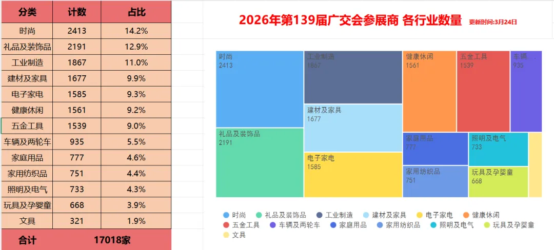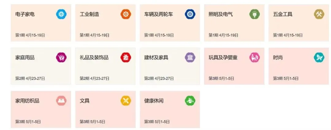 车辆及两轮车,电子家电,工业制造,家庭用品,家用纺织品,建材及家具,健康休闲,礼品及装饰品,时尚,玩具及孕婴童,文具,五金工具,照明及电气