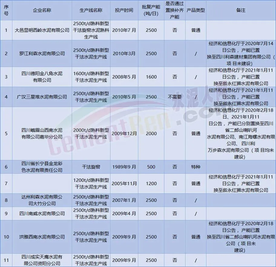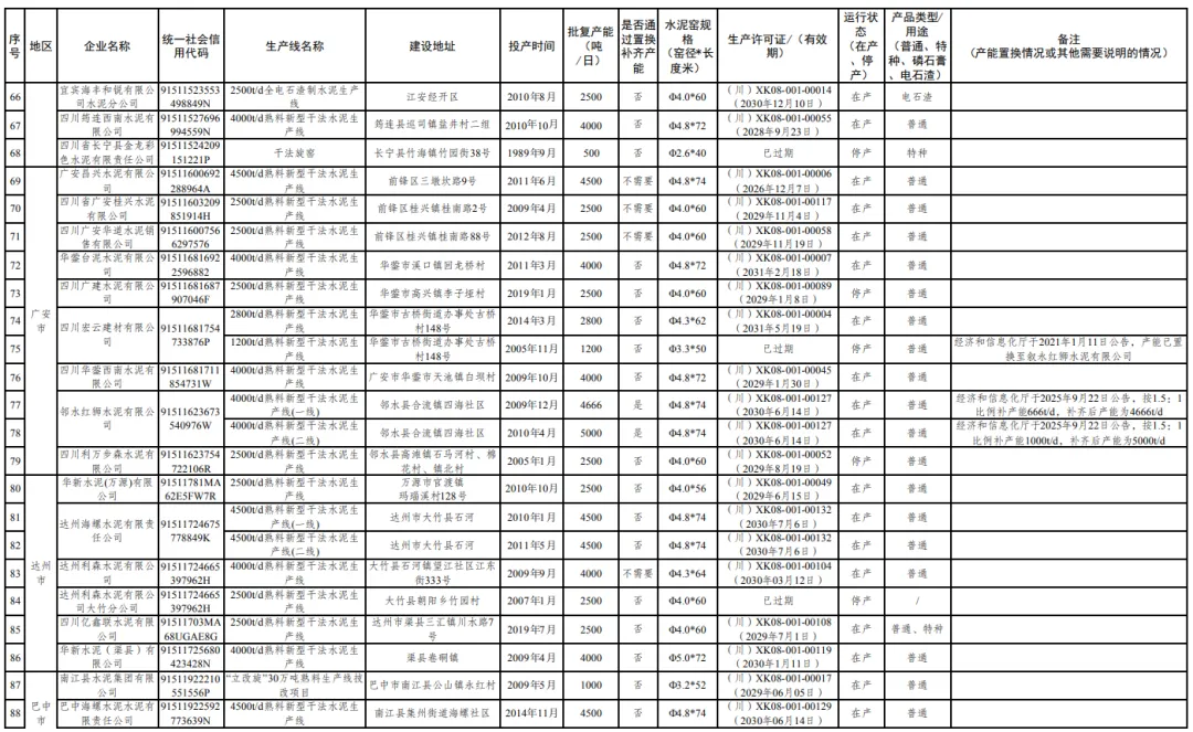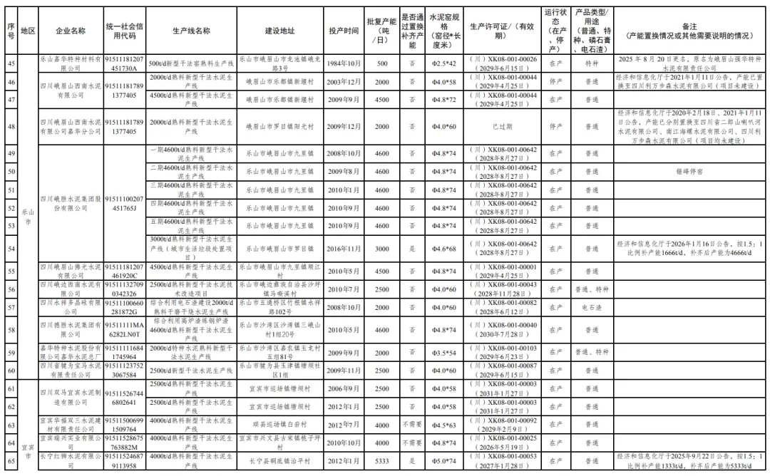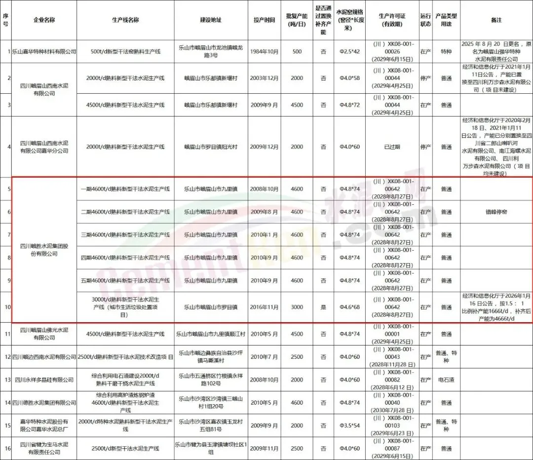 此外,公示还披露了部分企业的产能置换及名称变更情况,如乐山嘉华特种材料有限公司于2025年8月20日更名,原名为峨眉山强华特种水泥有限责任公司;四川成实天鹰水泥有限公司等企业的产能已完成置换,进一步优化了全省水泥行业布局。