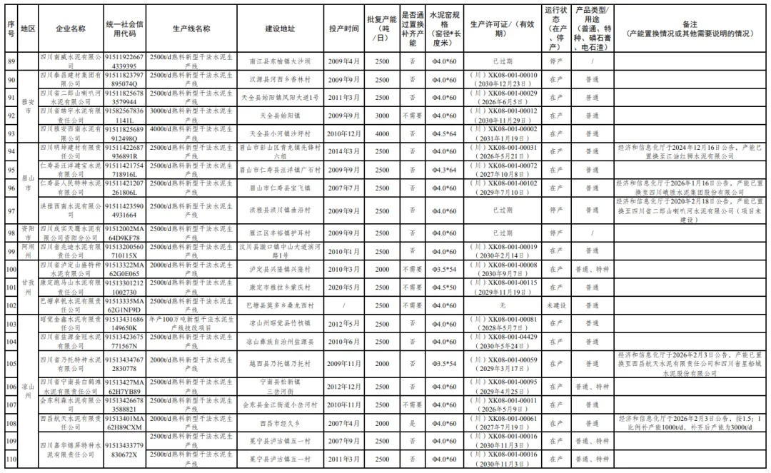 3月24日,四川省经济和信息化厅正式公示截至2025年12月31日的水泥熟料和平板玻璃生产线清单。此次公示详细披露了全省110条水泥熟料生产线的具体信息,涵盖企业名称、建设地址、产能规模、运行状态等核心内容。