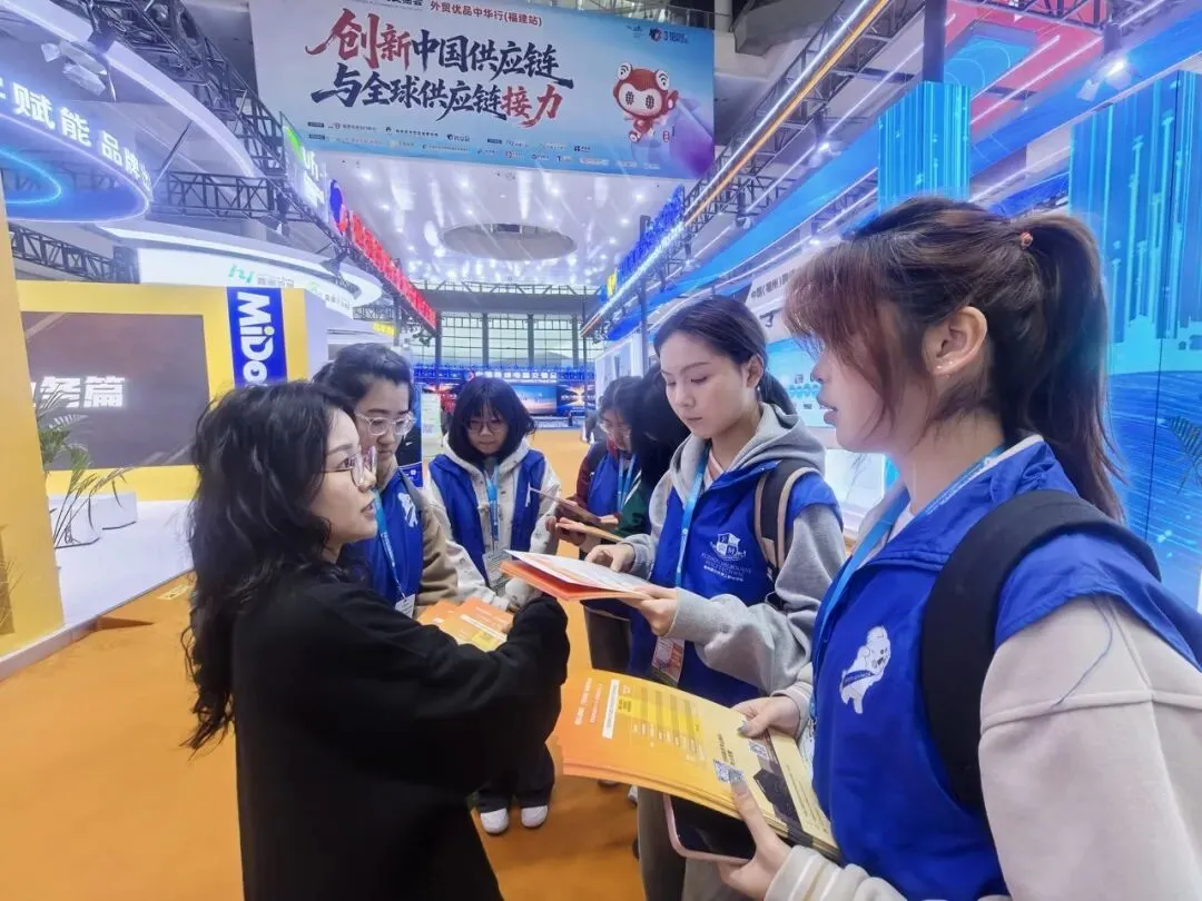企业导师领航,沉浸式“实战”练兵。在福建米多多网络科技有限公司企业导师的全程指导下,同学们深入各大展区,全景式观摩跨境商贸洽谈流程。大家主动对接参展商与客商,将商务英语应用、跨文化交际及外贸实务等理论知识转化为现场实操能力,真正做到了“学用结合、知行合一”,推动了课堂教学与产业前沿的深度融合。