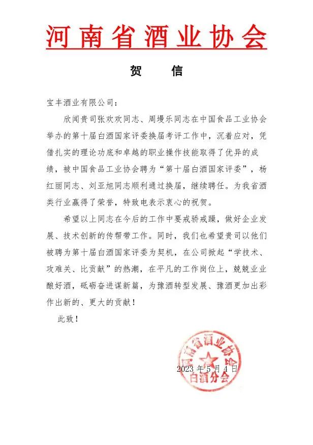希望以上同志在今后的工作中要戒骄戒躁,做好企业发展、技术创新的传帮带工作。同时,我们也希望贵司以他们被聘为第十届白酒国家评委为契机,在公司掀起“学技术、攻难关、比贡献”的热潮,在平凡的工作岗位上,兢兢业业酿好酒,砥砺奋进谋新篇,为豫酒转型发展、豫酒更加出彩作出新的、更大的贡献!