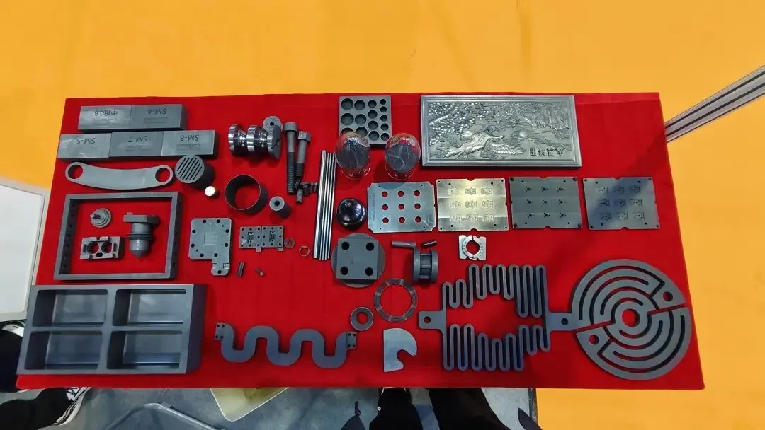 展位背景板上“至善匠心品质”的承诺,与展台上一件件打磨精细的样品相互呼应。不同规格的石墨棒、模具,见证着“定制化生产”对产业需求的精准响应;甚至还有一块石墨雕刻板上的花鸟纹样,让工业材料多了几分艺术质感。