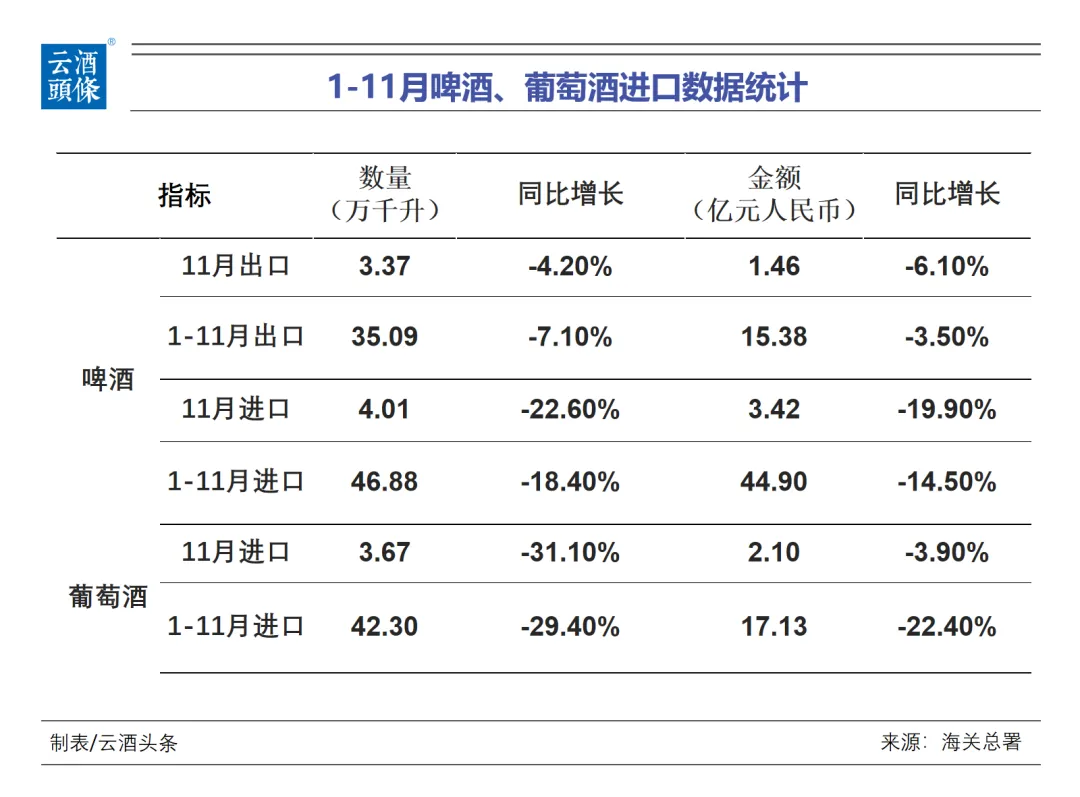 1-11月啤酒、葡萄酒进出口量下降