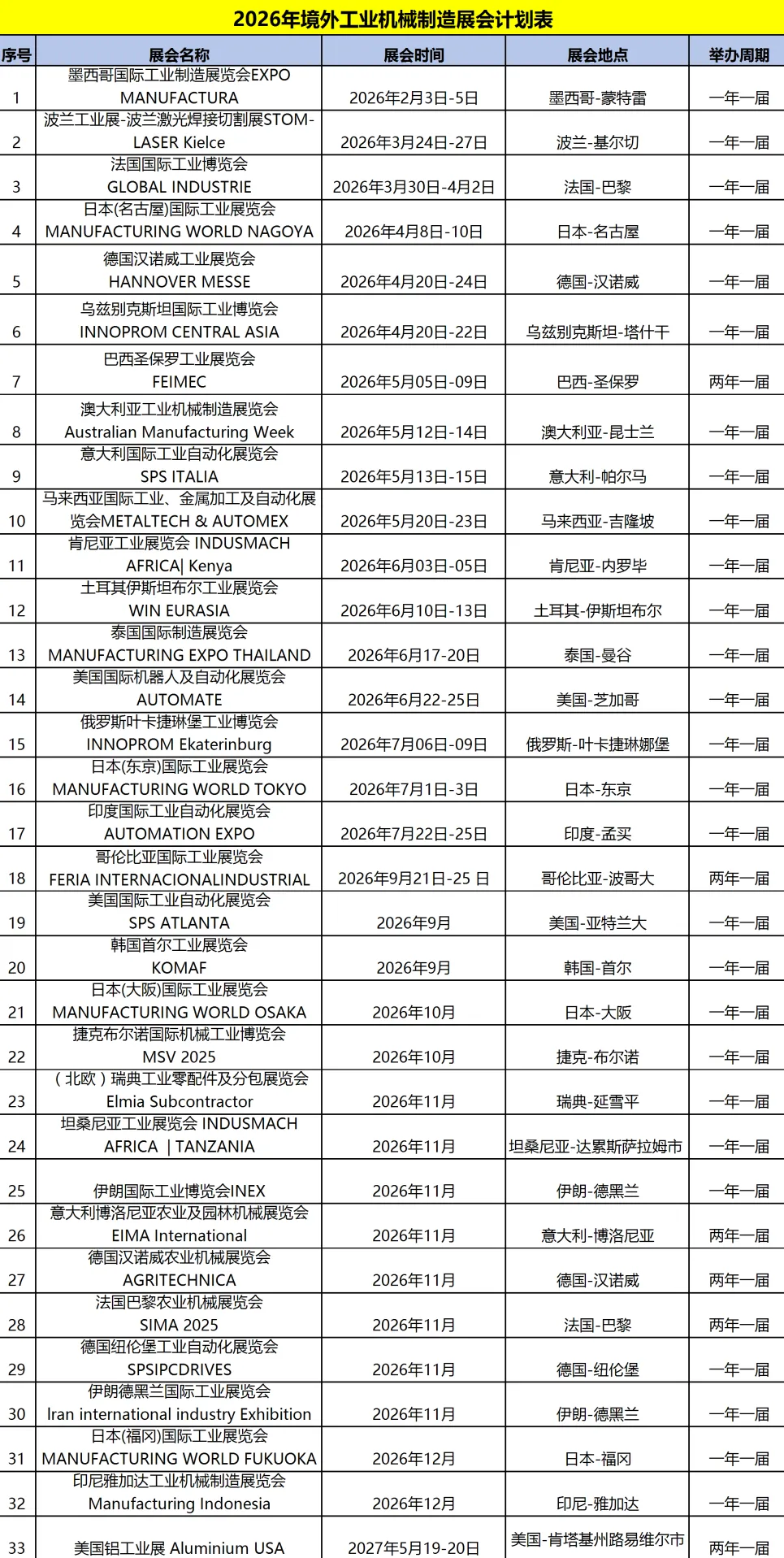 2026年全球工业机械制造展览会计划表