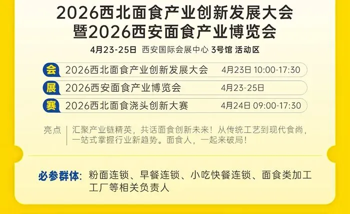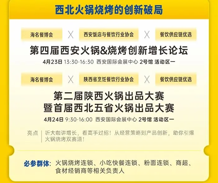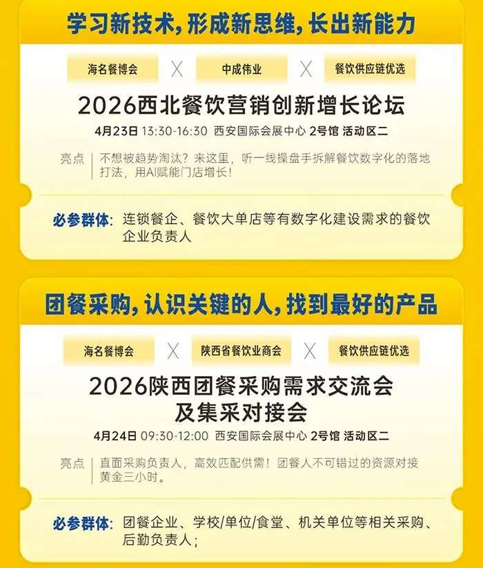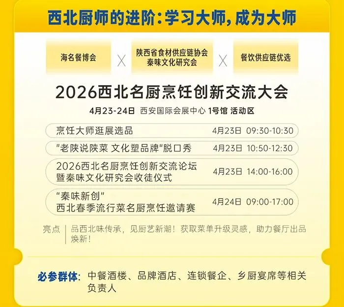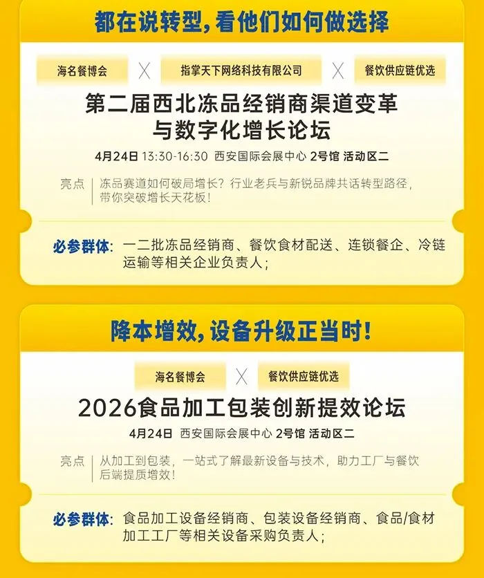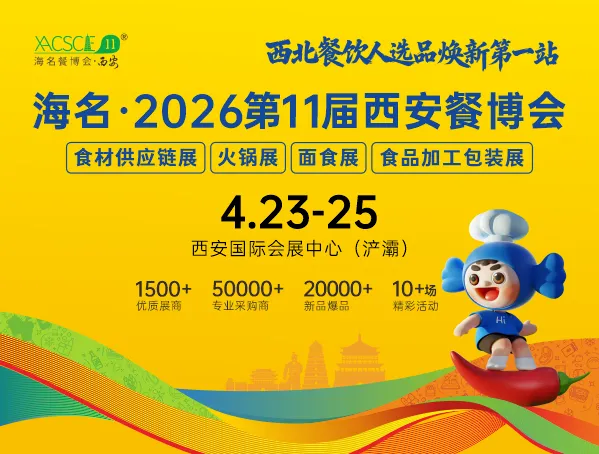 海名·2026第11届西安餐饮供应链博览会于2026年4月23-25日在西安国际会展中心(浐灞)举办!是西北地区春季首场餐饮供应链品牌大展,邀请来自全国近1500+家餐饮供应链品牌企业携近万种新产品、新技术参展,预计吸引全国近50000+专业采购商。展会主题涵盖预制食材、火锅、烘焙茶饮、餐饮设备、食品加工包装机械、陕菜供应链、面食产业、连锁加盟等多领域。展品涵盖水产、肉禽、火锅食材、调味品、米面粮油,冷冻食品、牛羊肉、烘焙茶饮、餐饮厨房设备、火锅设备用品、餐饮外卖包装用品、冷链仓储配送、食品加工包装机械、面食加工机械、陕菜供应链等多个类别全品类展出。