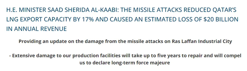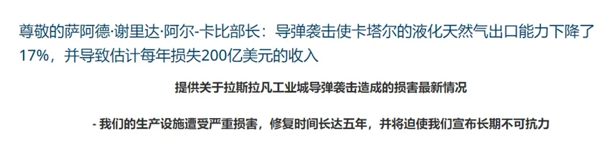 尊敬的部长阿尔-卡比表示:“液化天然气设施所受的损害将需要三到五年才能修复。影响主要针对中国、韩国、意大利和比利时。这意味着我们将被迫在某些长期LNG合同上宣告最长五年的不可抗力。”
