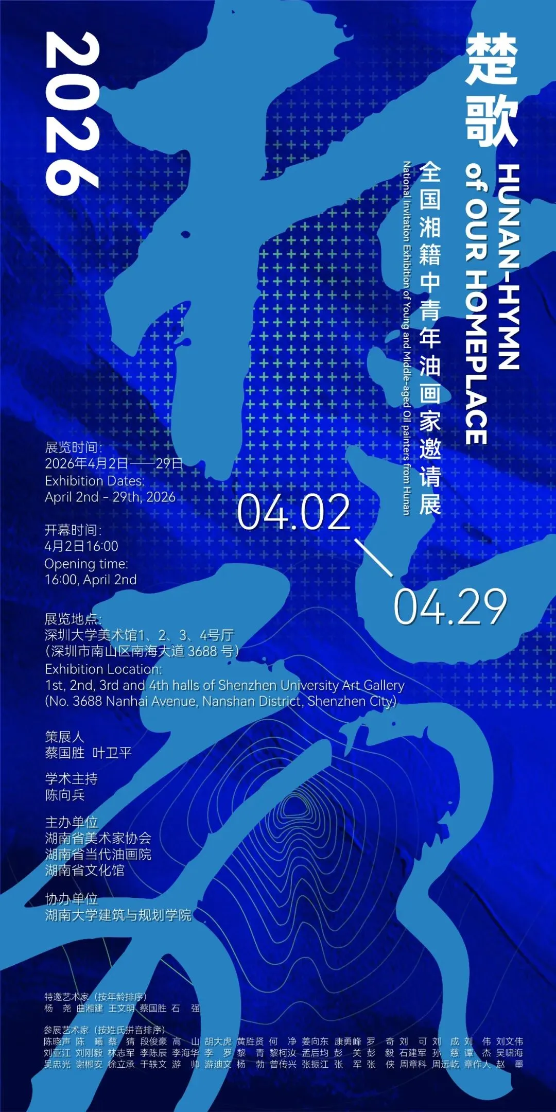 “楚歌——全国湘籍中青年油画家邀请展”既是50位湘籍油画家艺术创作的一次集体呈现,更是他们自觉进行文化建构的一次重要实践,力求在历史的纵深与当代的现场之间搭建起桥梁,推动湖南油画在学术与社会层面产生更为深远的影响。我们于2026香港巴塞尔艺术展落幕之际,选择在与香港一江之隔的我国改革开放的前沿城市深圳举办此次展览,寓意深远——湖南油画将以更加开放包容的姿态,拥抱时代,对话世界。展览旨在增强全国湘籍油画家的凝聚力,集中推介湘籍油画名家的创作成果,发掘与培养湘籍油画新人,进一步推动湖南油画事业的持续繁荣与发展。湘籍油画家聚是一团火,散是满天星,此次深圳集结,既是对故乡的回望,更是对未来的奔赴。