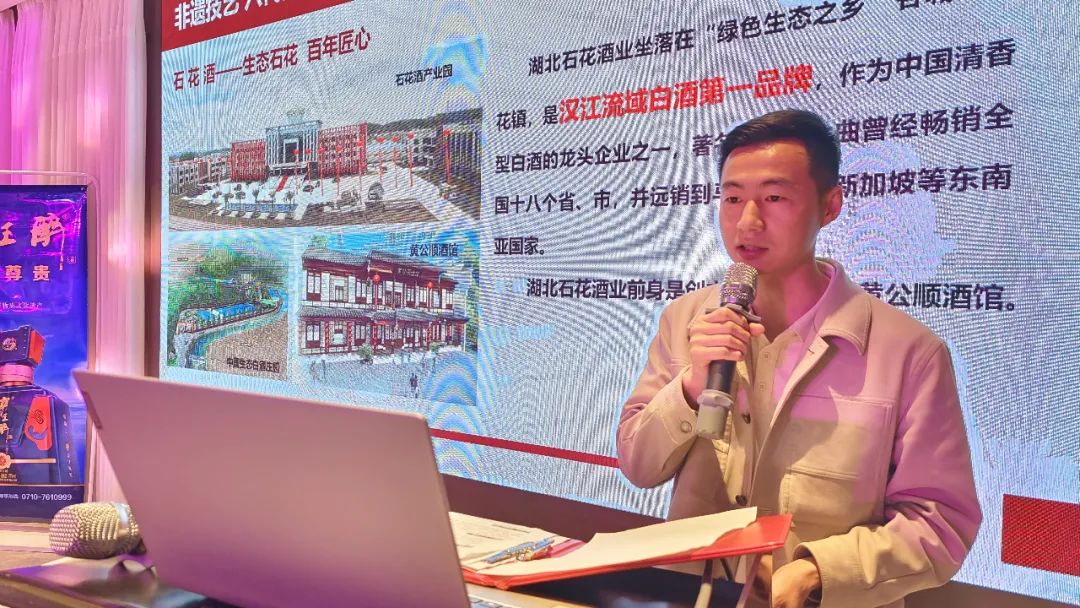 襄阳大区霸王醉品牌代言人张超为嘉宾介绍了《中国高端清香代表品牌——霸王醉》品牌PPT。霸王醉的尊贵,源于石花酒业153年来的传承;霸王醉的尊贵,源于华夏酒祖、楚国宫廷酒、霸王出征酒等“十二种身份”;霸王醉的高品质,源于石花酒业始终坚守“甜心水、放心粮、红心曲、匠心酿、真心藏”的“五心级”酿造标准。