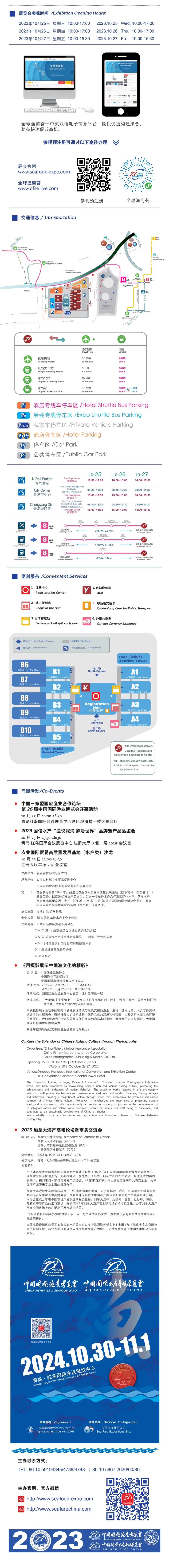 第 26 届中国国际渔业博览会和中国国际水产养殖展览会于 2023 年 10 月 25-27 日在青岛·红岛国际会展中心举办,展会由中国国际贸促会农业行业分会(农业农村部农业贸易促进中心)主办,美国海洋展览公司协办。本届展会展出规模 11 万平方米,有来自 51 个国家和地区的超过 1650 家参展商参展,参展商及贸易观众可通过专属线上商务平台“全球渔商荟”获得数字化信息查询及智能化商务匹配服务。