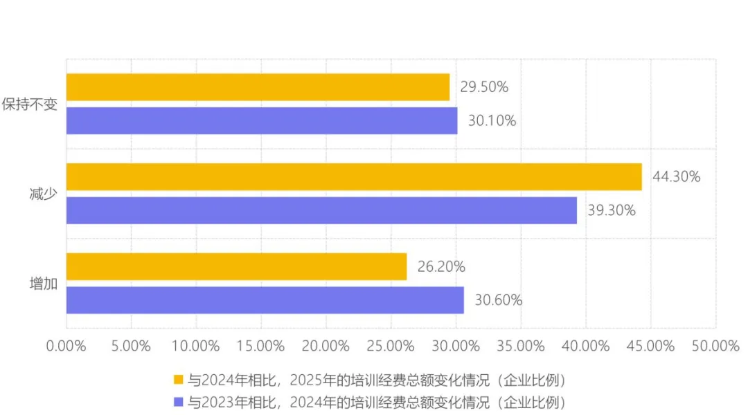 报告调研数据揭示了一个显著趋势:企业培训预算持续下行,且“剪刀差”不断扩大。2024年培训经费缩减的企业占比达39.3%,至2025年,这一比例进一步攀升至44.3%;而预算增加的企业锐减至26.2%。经费缩减与增加的比例差距,从2024年的8.7个百分点扩大至2025年的18.1个百分点。