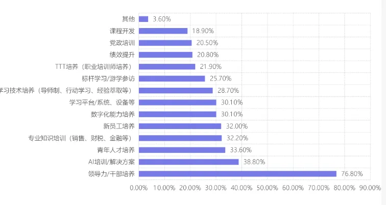 从外部投入的视角切入,企业培训同样呈现出明显的结构性倾向。调研数据显示,在“采购的外部培训项目及服务包含哪些领域”中,“领导力/干部培养”以76.80%的占比位居首位,显著高于其他类别;这一趋势在“课程主题类别”中进一步体现,管理类课程占比达69.10%,战略类课程占比为46.20%,反映出企业对管理者能力与战略思维的高度重视。