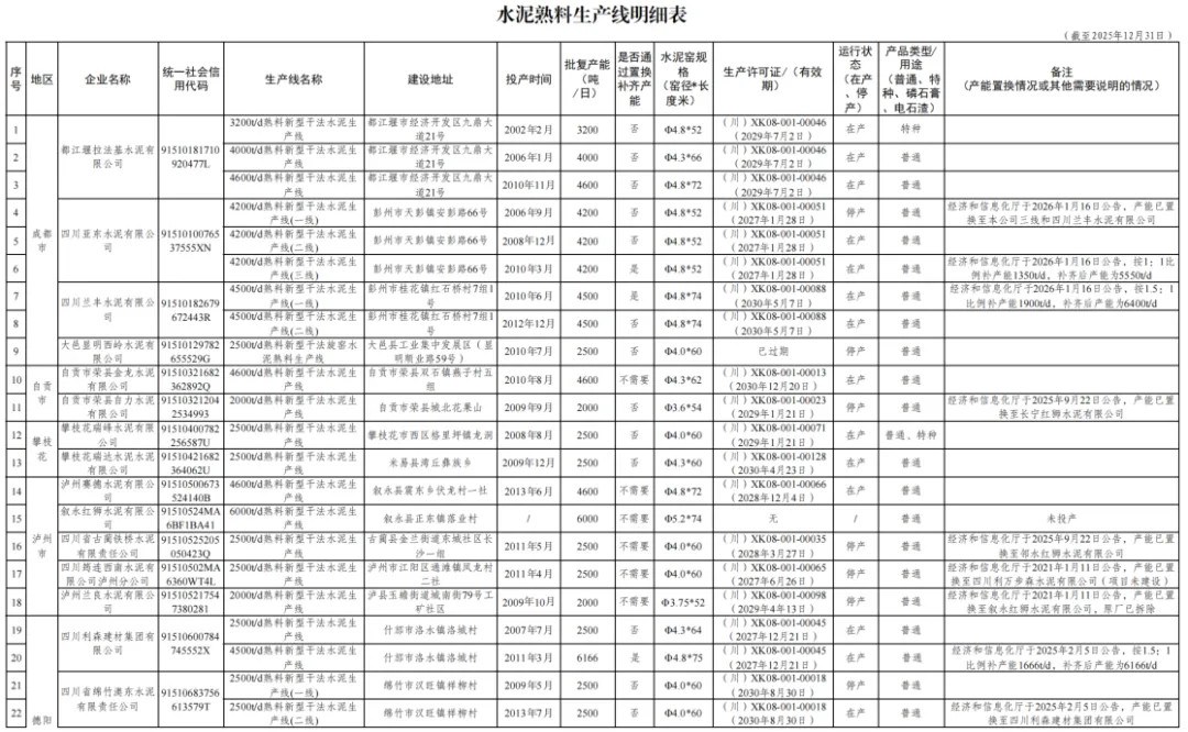 8.罗江利森水泥有限公司—条2500t/d 熟料生产线,产能已置换至四川利森建材集团有限公司(项目未建设);
