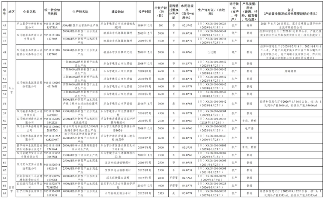 12.四川峨眉山西南水泥有限公司一条2000t/d熟料生产线,产能已置换至四川利森建材集团有限公司(项目未建设);