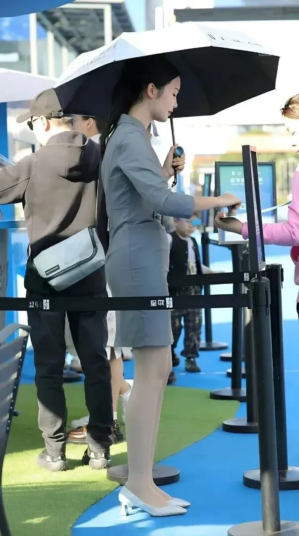 梳着低马尾的小姐姐一身灰色深V领西装套裙,腰围刚刚合适地勾勒出来,再加同色系宽腰封和银色扣子,精致到了无以复加的程度。脚上的珍珠白尖头细高跟鞋加上浅色丝袜,显得腿更长直了。手持黑白色相间的图案遮阳伞的人的手把手可以很好地把整个作品表现出来。整个人站着在那里,就是优雅本雅。